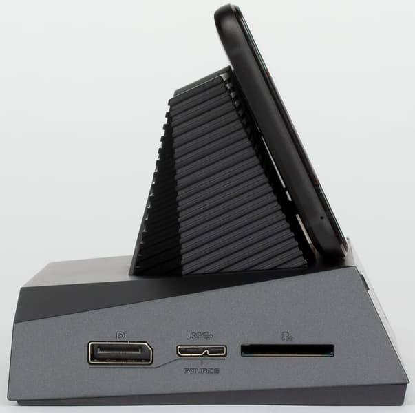 А также более продвинутая док-станция Mobile Desktop, имеющая большое количество портов и позволяющая разделять монитор и периферийные устройства между смартфоном и персональным компьютером (для переключения между смартфоном и ПК нужно нажимать кнопку на док-станции).