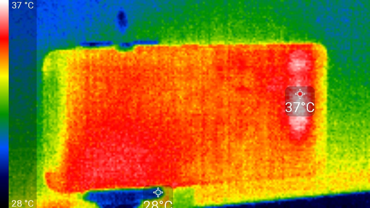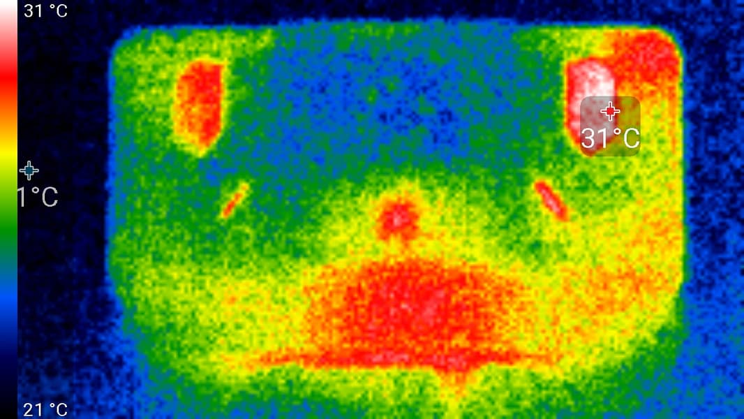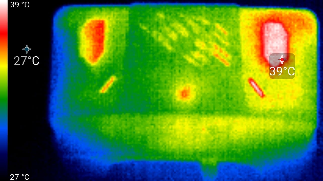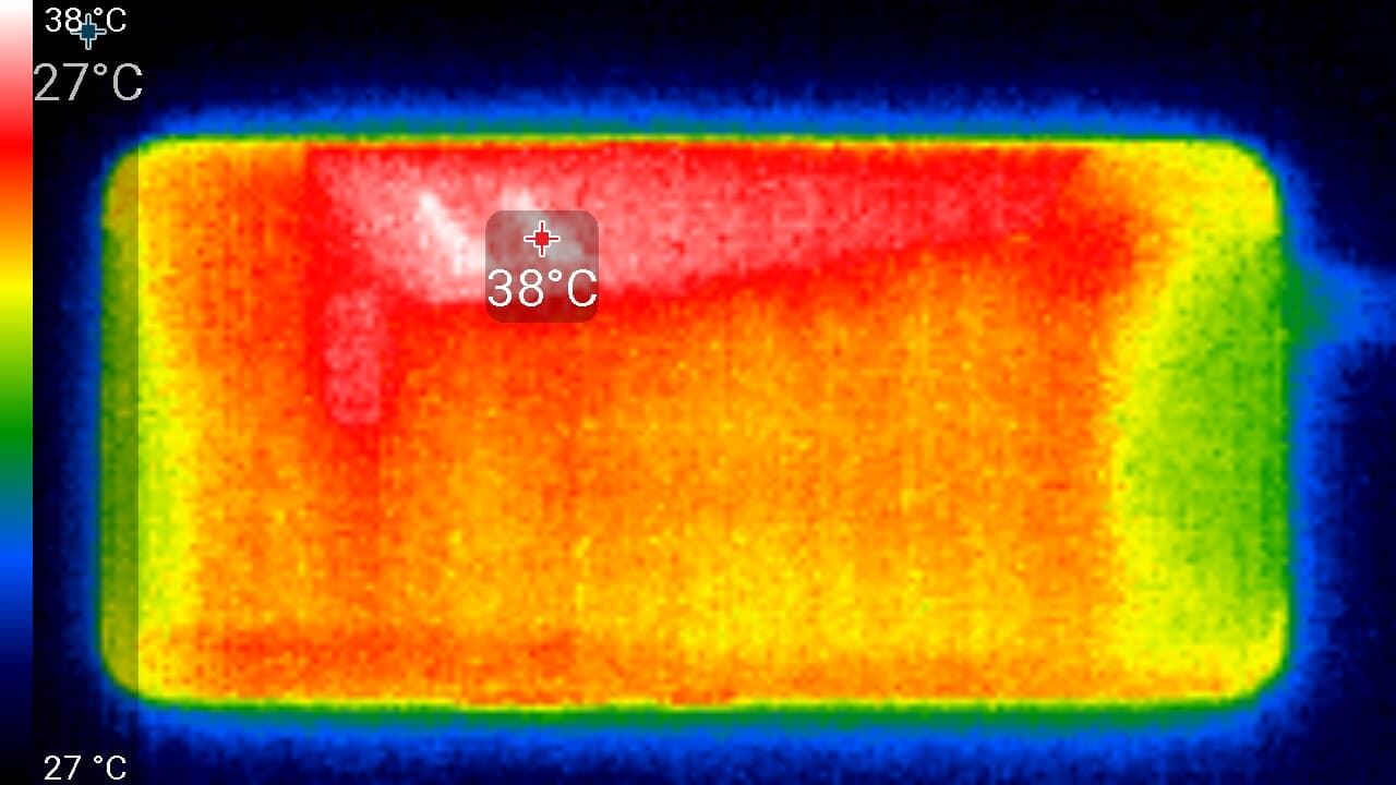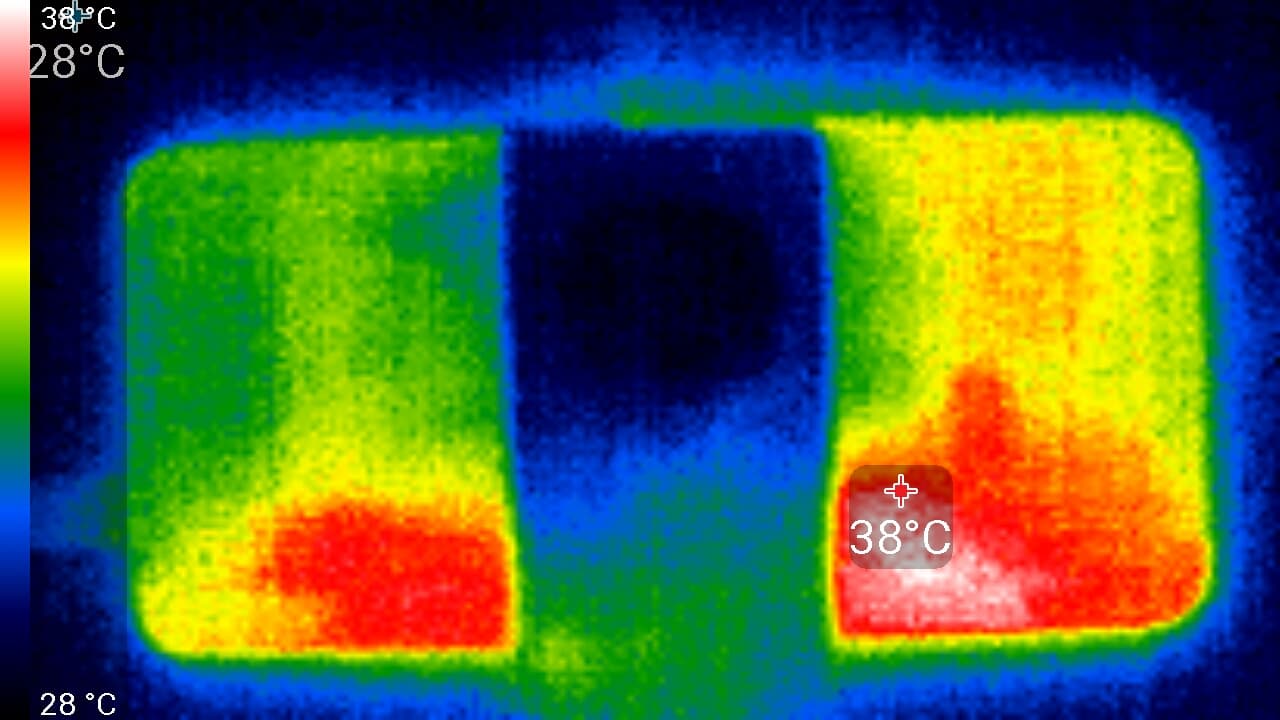 Нагрев выше там, где расположено что-то вроде вентиляционных решеток. По данным теплокамеры, максимальный нагрев составил 38 градусов (при температуре окружающего воздуха в 24 градуса), это не очень много.