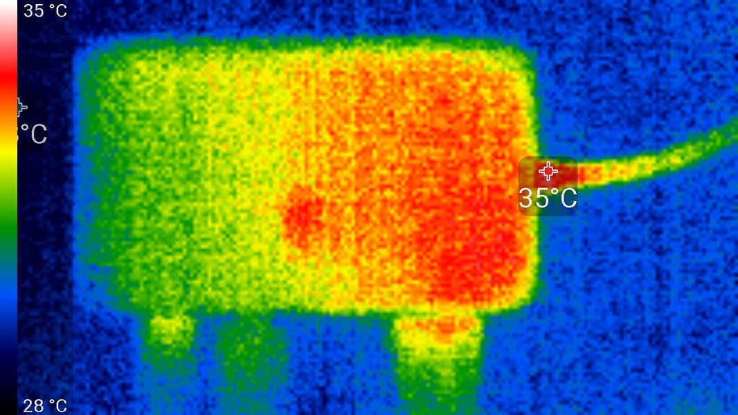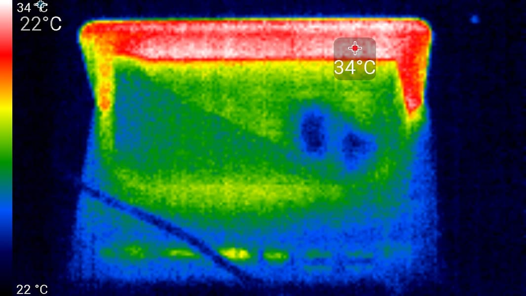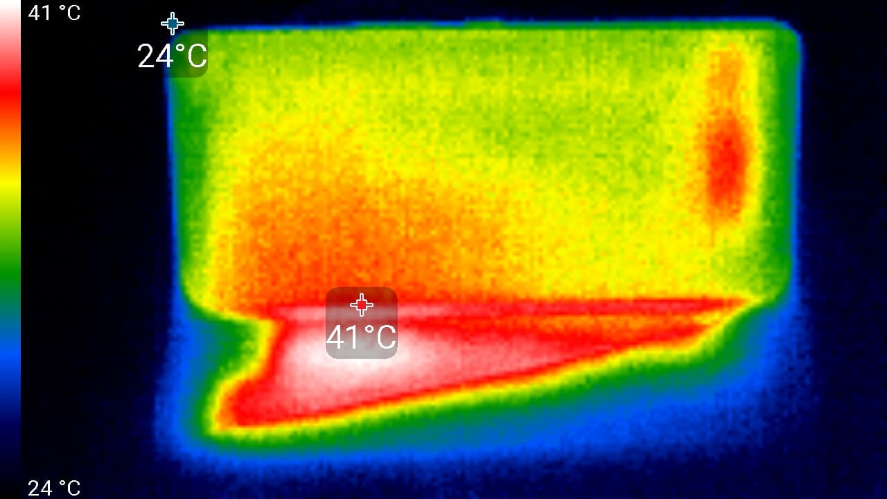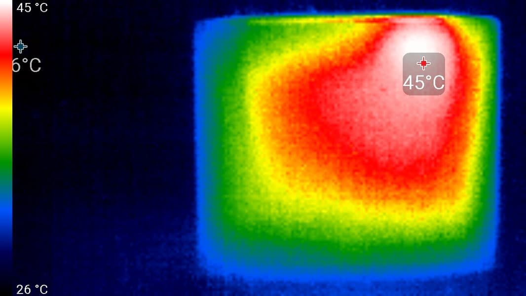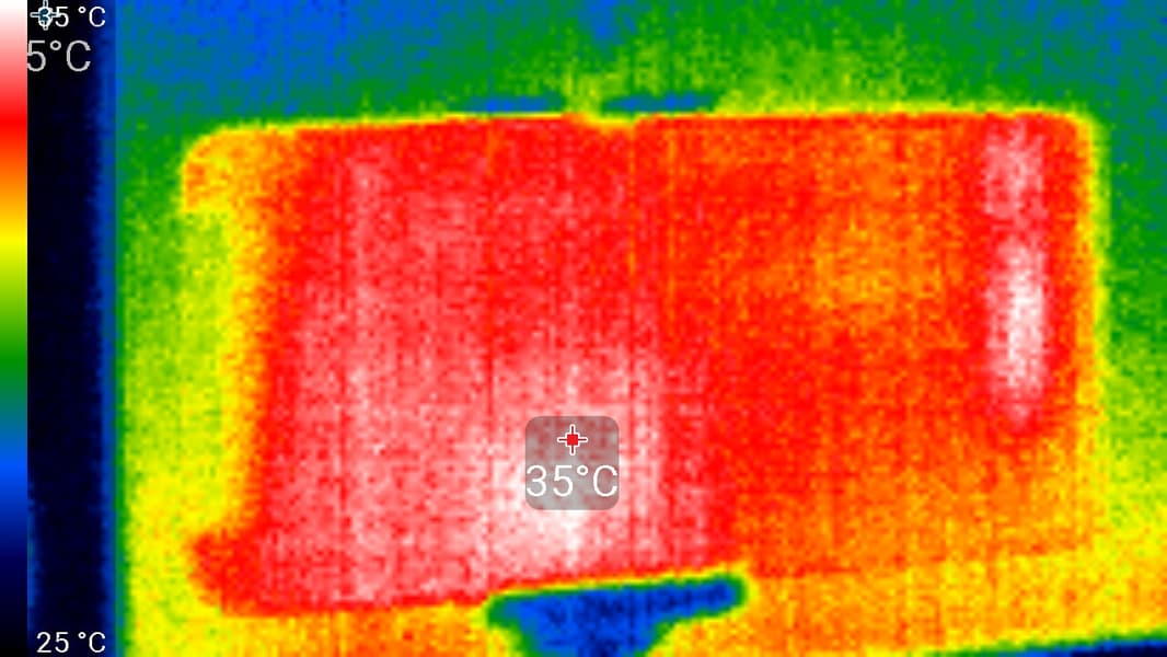 Нагрев выше там, где расположено что-то вроде вентиляционных решеток. По данным теплокамеры, максимальный нагрев составил 38 градусов (при температуре окружающего воздуха в 24 градуса), это не очень много.