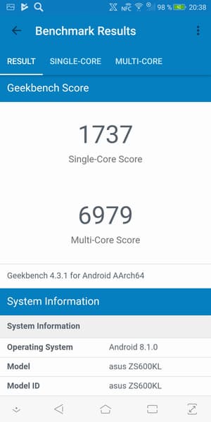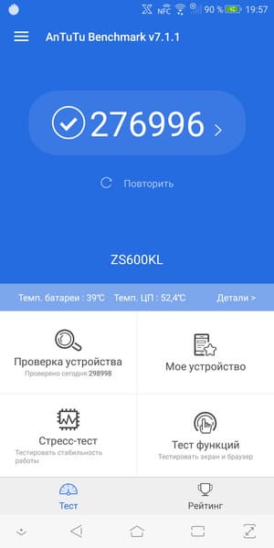 Qualcomm Snapdragon 845 — это флагманская платформа лидера рынка мобильных SoC, одно из самых мощных решений для смартфонов. К тому же, здесь, по уверениям Asus, используются исключительно отборные процессоры с тактовой частотой ядер выше, чем у обычных серийных экземпляров — до 2,96 ГГц. Соответственно, герой обзора и в бенчмарках, и в реальном использовании демонстрирует максимальную производительность. Впрочем, добиться в бенчмарках результатов выше, чем у других обладателей такой же платформы, нам не удалось.