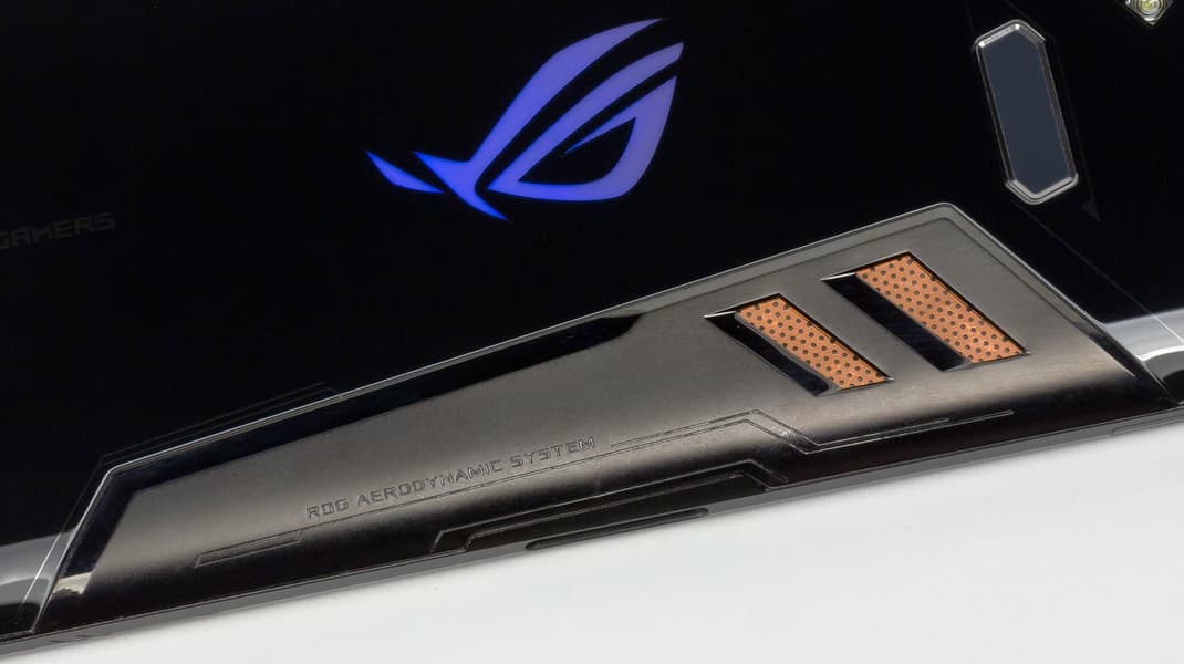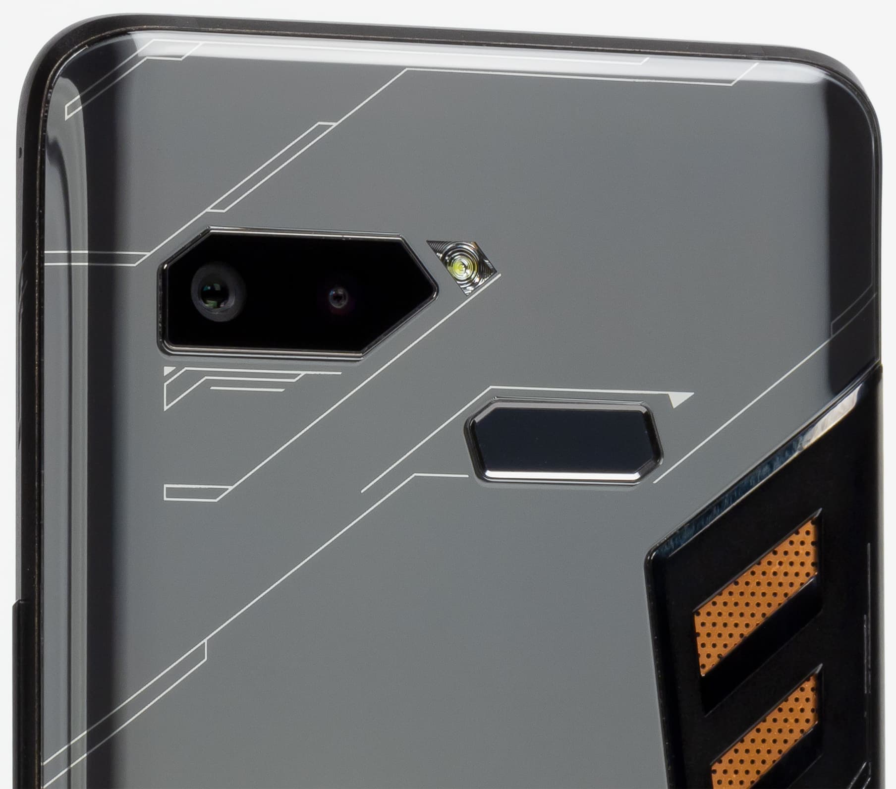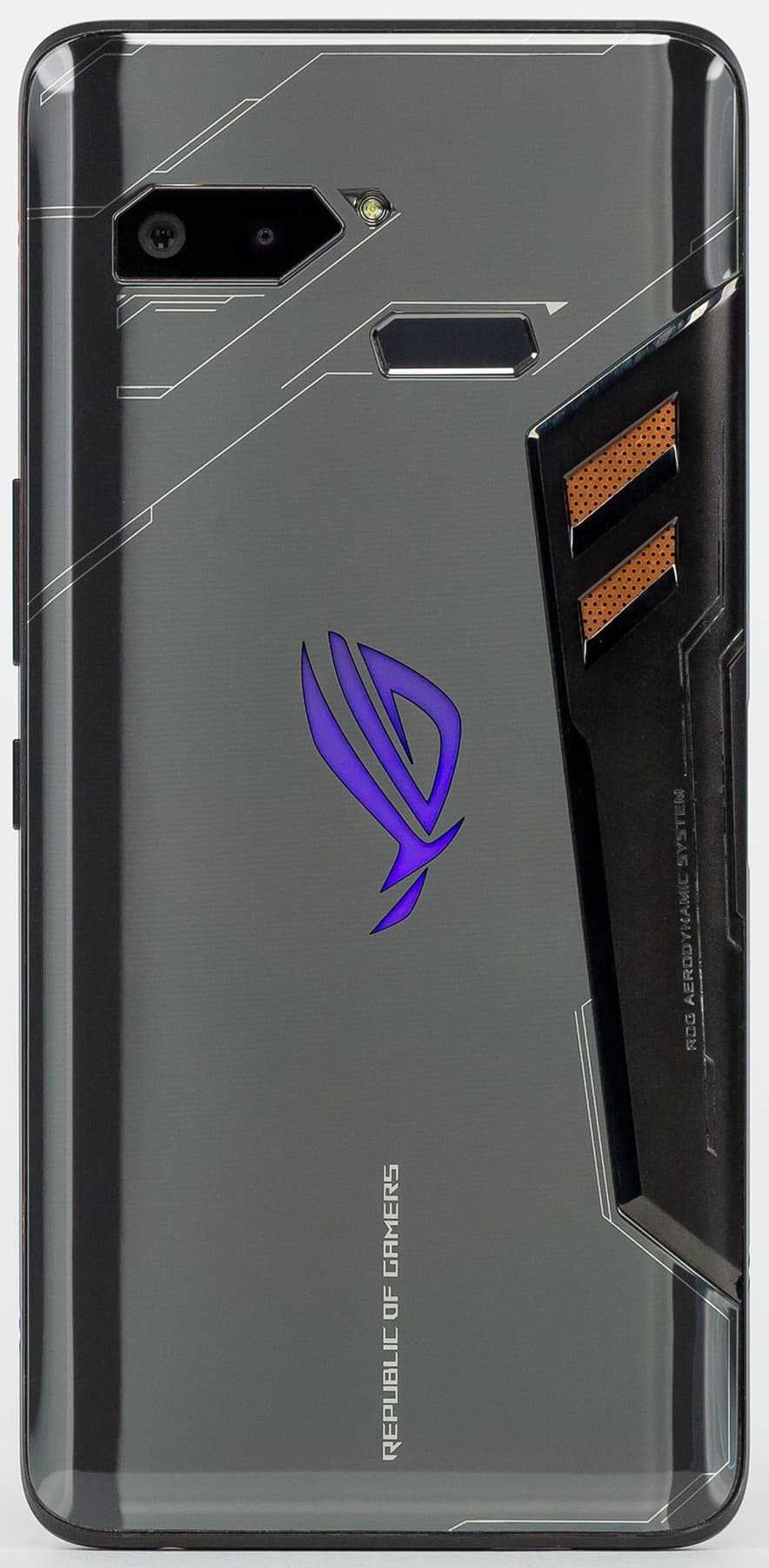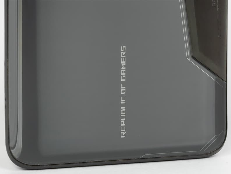 Заднее стекло, как и переднее, произведено компанией Corning. Тыльная панель оформлена асимметричным рисунком и дополнена светящимся логотипом ROG с настраиваемой светодиодной подсветкой. Помимо стекла здесь есть еще матовая металлическая вставка с парой медных решеточек.