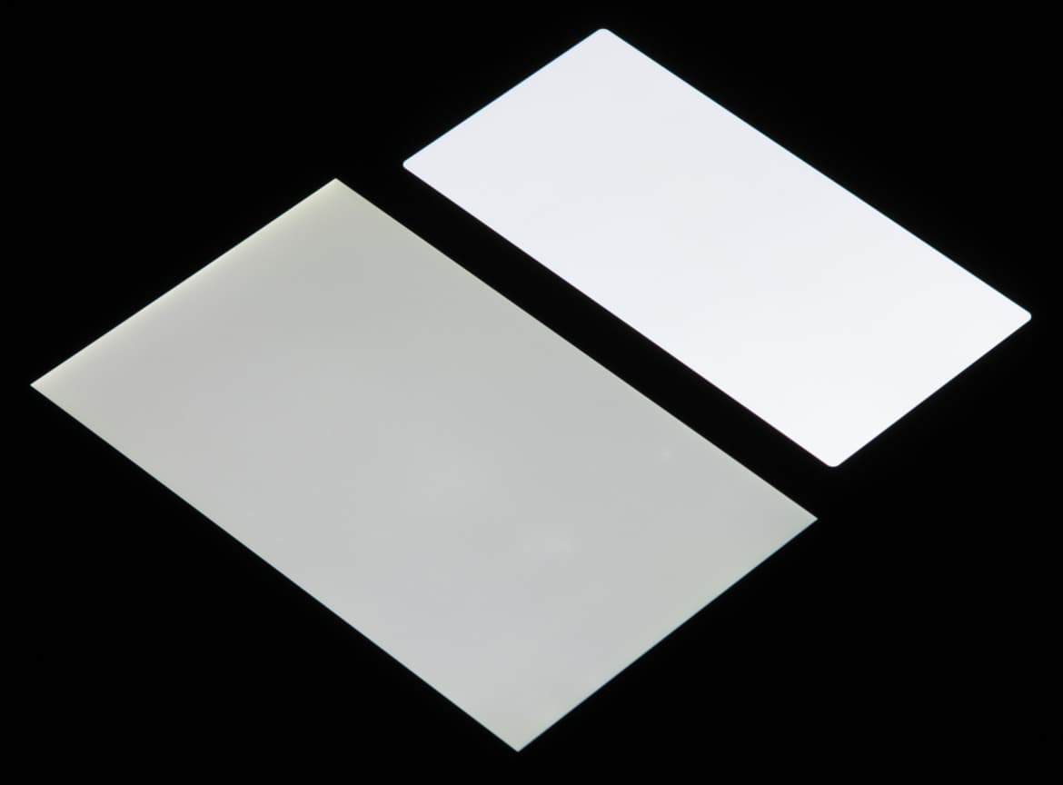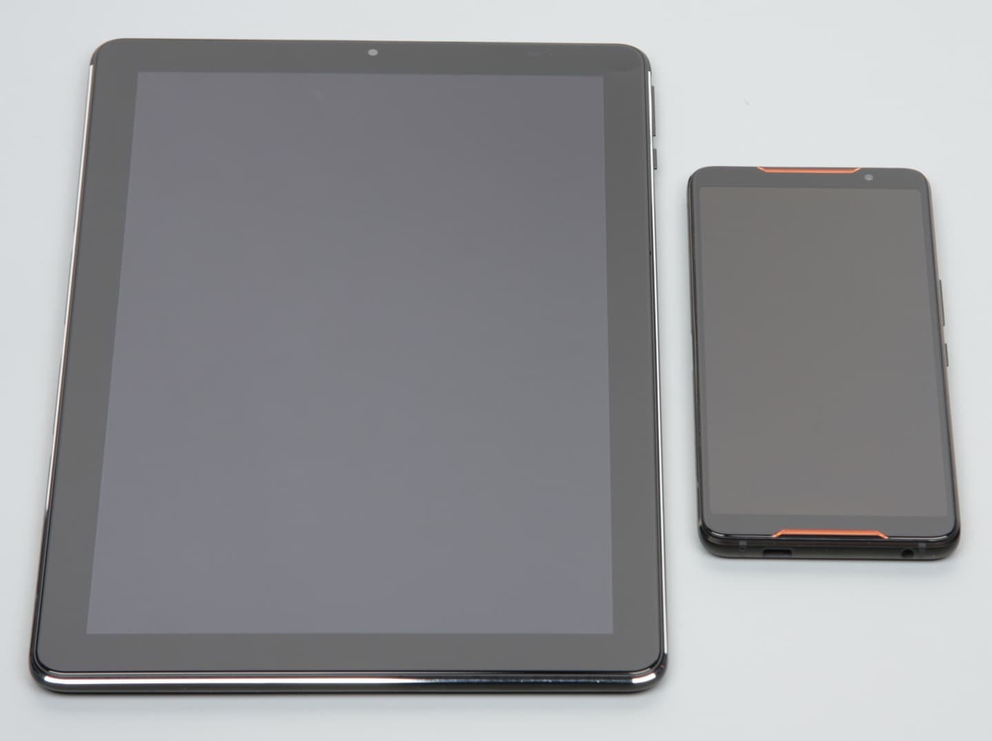 Лицевая поверхность экрана выполнена в виде стеклянной пластины с зеркально-гладкой поверхностью, устойчивой к появлению царапин. Судя по отражению объектов, антибликовые свойства экрана лучше, чем у экрана планшета Chuwi Hi9 plus. Для наглядности приведем фотографию, на которой в выключенных экранах обоих устройств отражается белая поверхность (Asus ROG Phone, как нетрудно определить, справа, далее их можно различать по размеру):