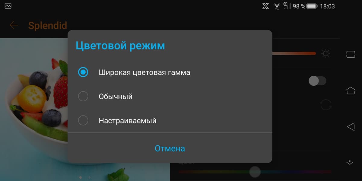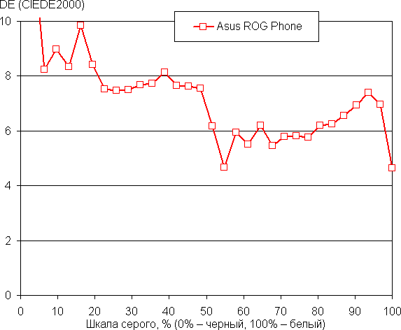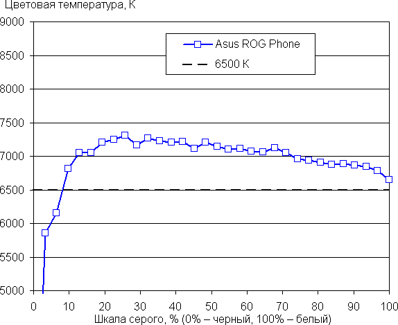 Баланс оттенков на шкале серого средний, так как цветовая температура заметно выше стандартных 6500 К (более 8000 К). Однако в этом смартфоне есть возможность подправить цветовой баланс регулировкой цветовой температуры (ползунок под надписью Цветовой режим):