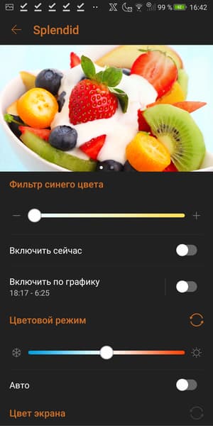 Присутствует настройка, позволяющая снизить интенсивность синей компоненты: Фильтр синего цвета. Напомним, что в принципе яркий свет может приводить к нарушению суточного (циркадного) ритма (см. статью про iPad Pro с дисплеем 9,7 дюйма), но эта проблема решается подстройкой яркости до комфортного уровня, а искажать цветовой баланс, уменьшая вклад синего, нет абсолютно никакого смысла.