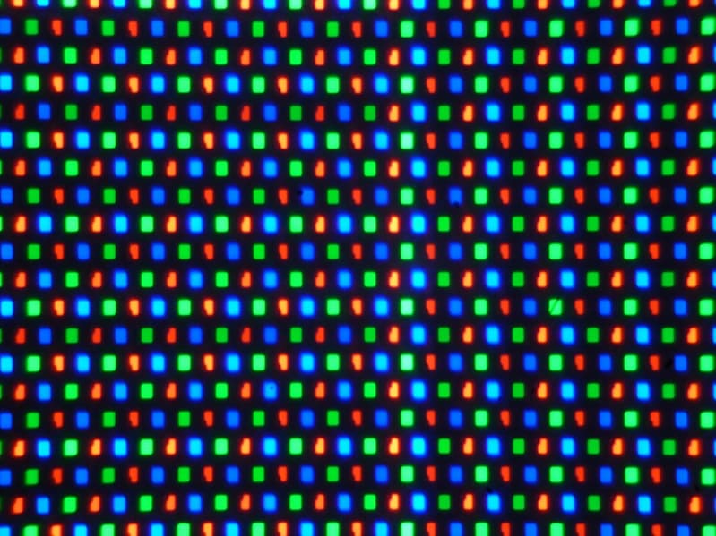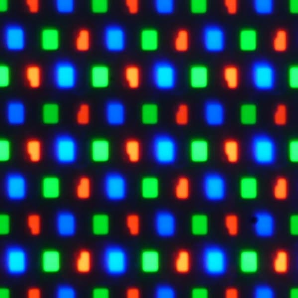 В этом экране используется матрица Super AMOLED — активная матрица на органических светодиодах. Полноцветное изображение создается с помощью субпикселей трех цветов — красного, зеленого и синего в равном количестве. Это подтверждается фрагментом микрофотографии: