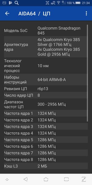 - SoC Qualcomm Snapdragon 845, 8 ядер (4 × Kryo 385 Gold @2,96 ГГц + 4 × Kryo 385 Silver @1,8 ГГц)
