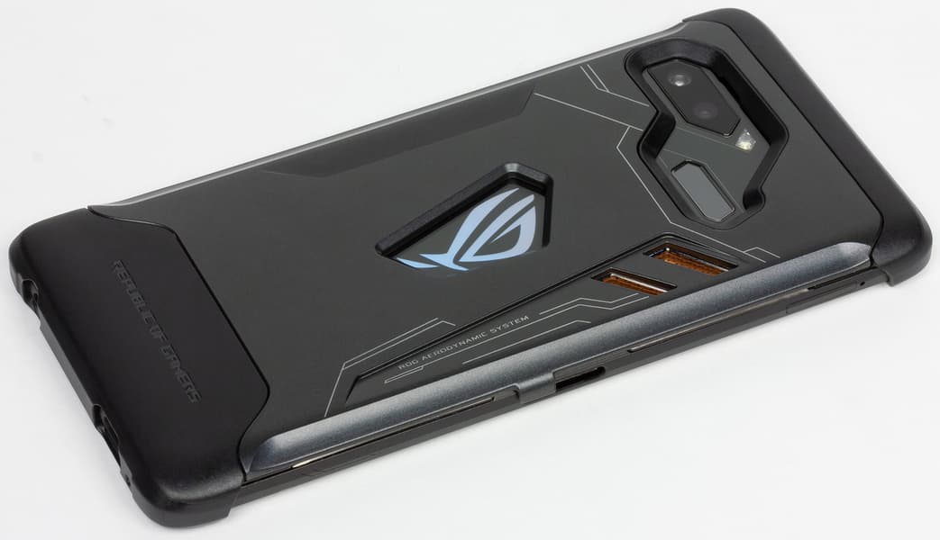 Asus ROG Phone получил нетипичный для смартфона футуристичный дизайн, в этаком знакомом каждому любителю компьютерных игр «геймерском» стиле. Похожим образом обычно оформляют корпуса системных блоков компьютеров, клавиатуры, мыши для геймеров и другую периферию. Здесь так оформлена задняя панель: несколько элементов с ломаной угловатой геометрией поддерживаются такого же вида подложкой под стеклом. Выглядит свежо, необычно и довольно привлекательно.