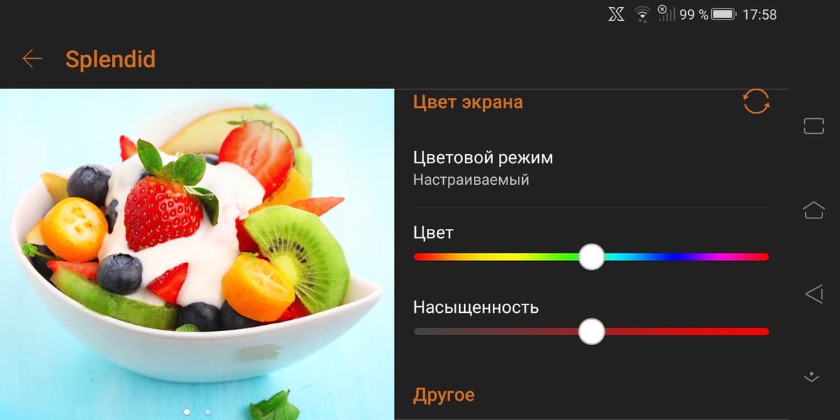 Этот экран по характеристикам (яркость, структура субпикселей, мерцание и т. д.) очень близок к экрану самого смартфона, но имеет свои особенности. В частности, при подключении смартфона к этой док-станции частота обновления фиксируется на значении 60 Гц и в настройках уже нельзя выбрать вариант «Обычный» для настройки Цветовой режим. Тут пригодится вариант «Настраиваемый» и ручная корректировка насыщенности, с помощью которой охват можно приблизить к sRGB: