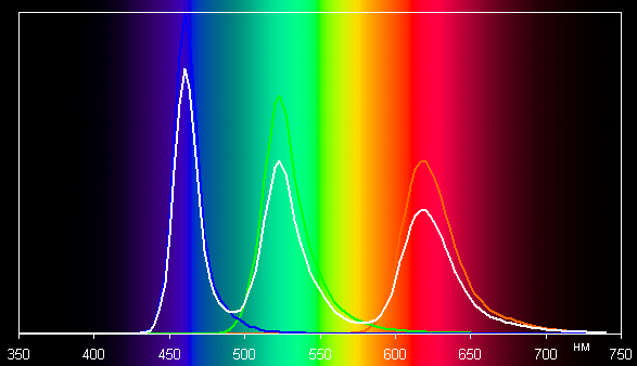 Видно, что охват близок к sRGB. И соответствующий спектр: