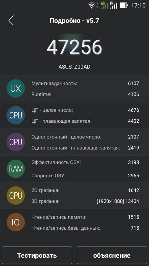 Zenfone 2 опять вырывает у MX4 Pro победу в одном из тестов, но по итогам всего исследования надо признать, что его позиция — рядом с Oppo N3 позади Meizu MX4 Pro. Результаты нашего героя оправдали все ожидания. Пусть он и не дотягивает до последних флагманов, но его производительность, безусловно, высока.