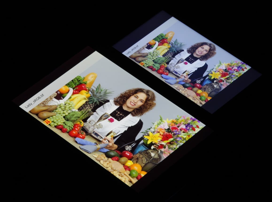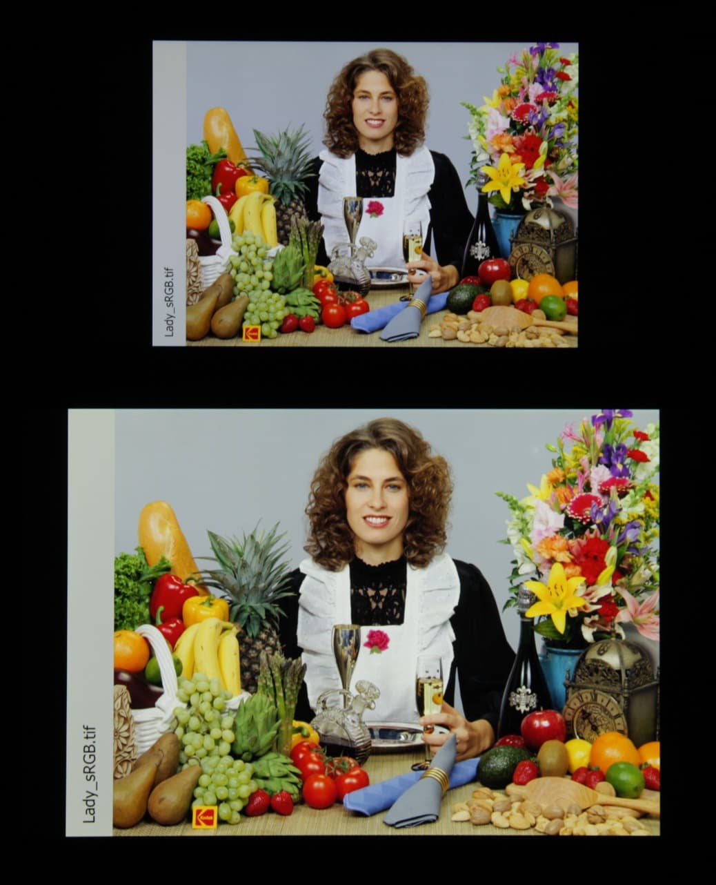 В итоге цвета имеют естественную насыщенность и оттенок. Баланс оттенков на шкале серого компромиссный, так как цветовая температура сильно выше стандартных 6500 К, но отклонение от спектра абсолютно черного тела (ΔE) ниже 10, что для потребительского устройства считается приемлемым показателем. При этом оба параметра мало изменяются от оттенка к оттенку — это положительно сказывается на визуальной оценке цветового баланса. (Самые темные области шкалы серого можно не учитывать, так как там баланс цветов не имеет большого значения, да и погрешность измерений цветовых характеристик на низкой яркости большая.)