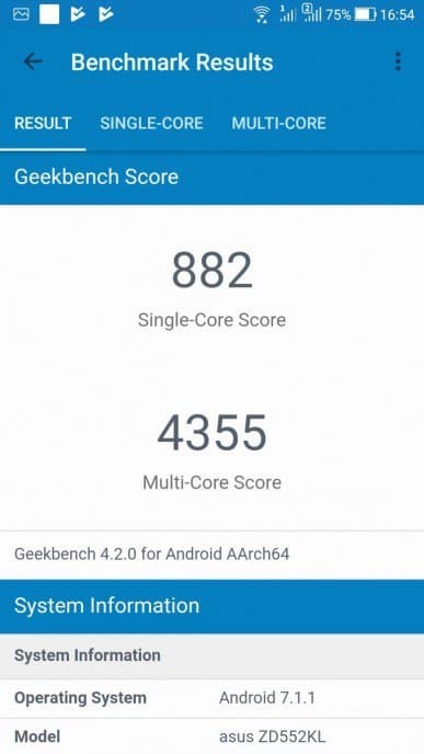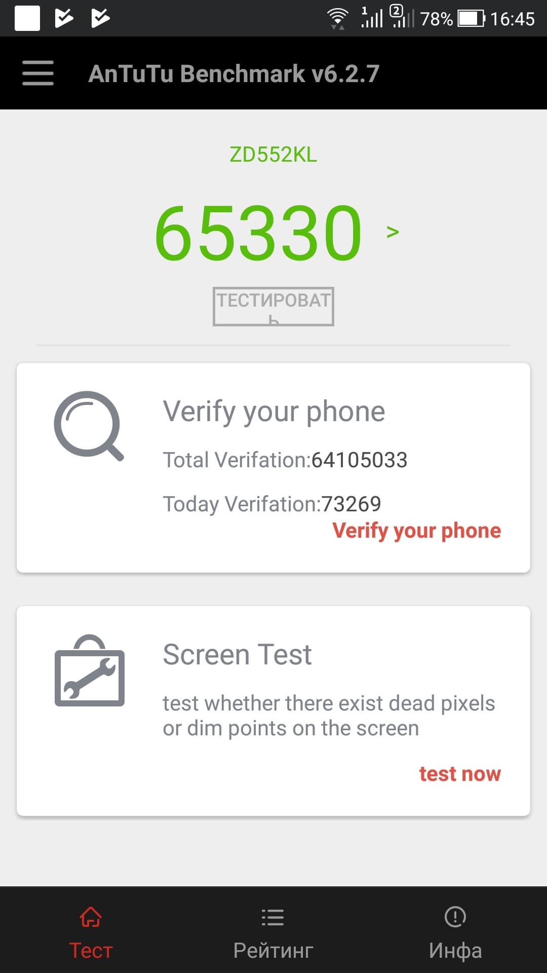И тем не менее, данная SoC все еще способна поддерживать современный смартфон на актуальном уровне, в тесте AnTuTu герой обзора набирает свои 65К очков. С данной платформой смартфон демонстрирует вполне уверенное быстродействие и в реальных сценариях работы, и в играх. Все проверенные нами игры, включая Modern Combat 5 и Mortal Kombat X, идут без малейших притормаживаний. Однако заметного запаса мощи для будущих обновлений у такой модели нет.