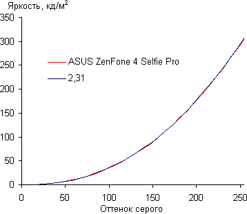 Построенная по 32 точкам с равным интервалом по численному значению оттенка серого гамма-кривая не выявила завала ни в тенях, ни в светах. Показатель аппроксимирующей степенной функции равен 2,31, что чуть выше стандартного значения 2,2, при этом реальная гамма-кривая очень мало отклоняется от степенной зависимости: