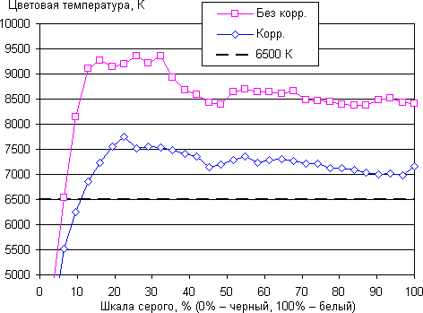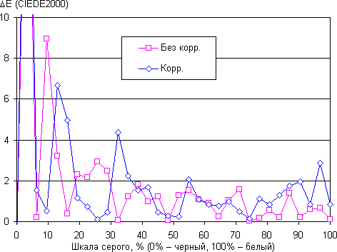 (Самые темные области шкалы серого в большинстве случаев можно не учитывать, так как там баланс цветов не имеет большого значения, да и погрешность измерений цветовых характеристик на низкой яркости большая.)