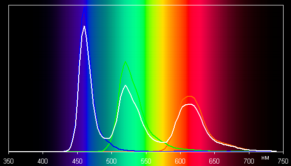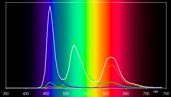 Без коррекции (профиль Суперцвет) спектры компонент (то есть спектры чистых красного, зеленого и синего цветов) очень хорошо разделены: