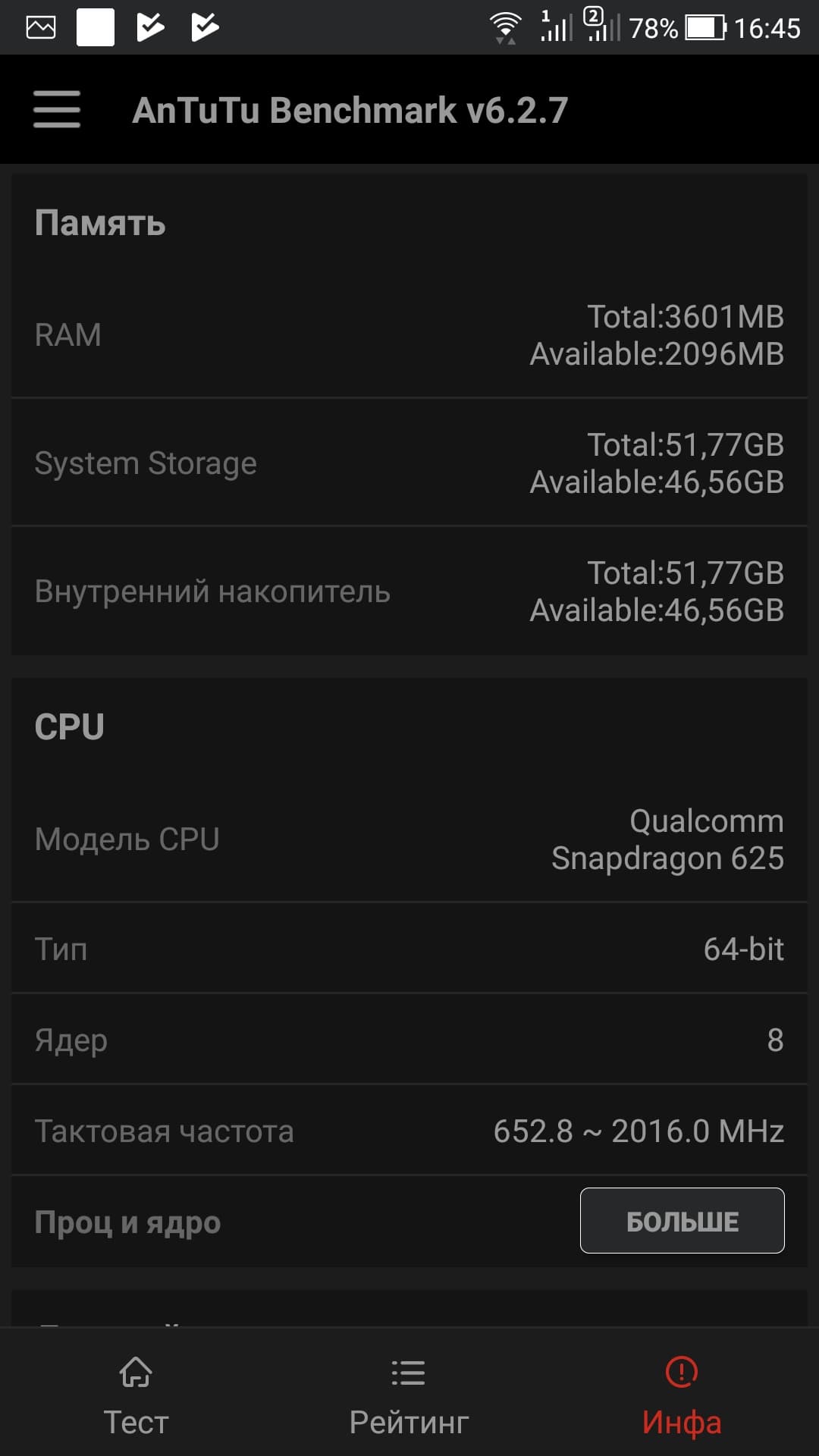 - SoC Qualcomm Snapdragon 625, 8 ядер ARM Cortex-A53 @2,0 ГГц