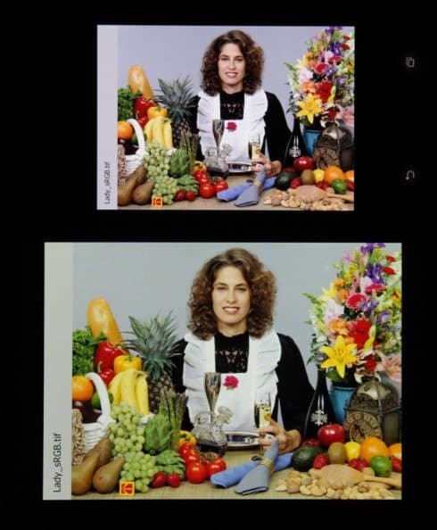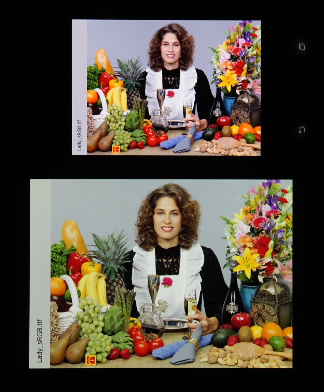 Согласно визуальной оценке, цвета у тестируемого экрана более-менее естественные, а цветовой баланс у экранов немного различается. Напомним, что фотография не может служить надежным источником сведений о качестве цветопередачи и приводится только для условной наглядной иллюстрации. Фотография выше получена после выбора профиля Стандартный в настройках экрана, всего их четыре:
