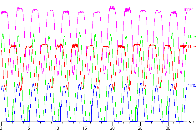 Практически на любом уровне яркости присутствует значимая модуляция с частотой 360 Гц. На рисунке ниже приведены зависимости яркости (вертикальная ось) от времени (горизонтальная ось) для нескольких значений яркости (100%+ — с дополнительной засветкой датчика):