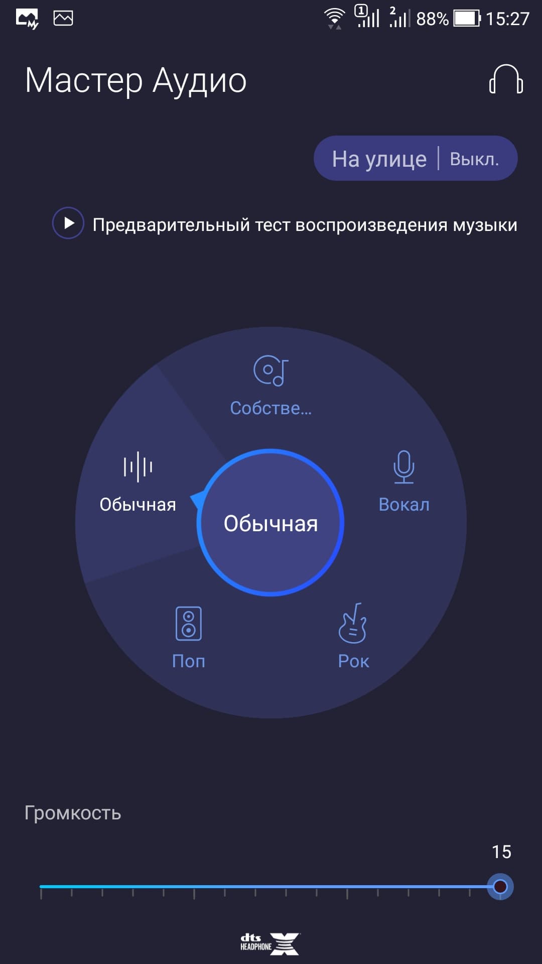 Для прослушивания музыки используется штатный плеер Google Music, для настройки параметров аудиосистемы служит знакомое приложение AudioWizard. Стереоэффекта, как в центральной модели Asus Zenfone 4, тут не создается, всегда работает только один динамик. Тем не менее, особых претензий к звуку нет: громкоговоритель звучит чисто, запас громкости достаточен. В наушниках звук тоже яркий, чистый и насыщенный, запас громкости велик. Более того, при подключенных наушниках используется технология пространственного звучания DTS Headphone:X.
