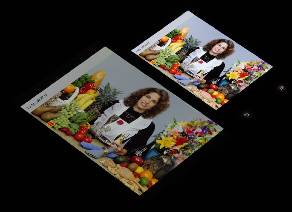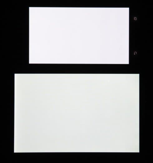 Экран характеризуется великолепными углами обзора. Правда, белый цвет при отклонении даже на небольшие углы приобретает легкий синеватый оттенок, но черный цвет остается просто черным под любыми углами. Он настолько черный, что параметр контрастности в данном случае просто неприменим. Для сравнения приведем фотографии, на которых на экраны Asus ZenFone 4 Selfie Pro и второго участника сравнения выведены одинаковые изображения, при этом яркость экранов изначально установлена примерно на 200 кд/м², а цветовой баланс на фотоаппарате принудительно переключен на 6500 К.