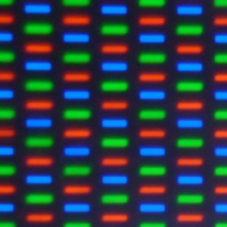 В этом экране используется матрица AMOLED — активная матрица на органических светодиодах. Полноцветное изображение создается с помощью субпикселей трех цветов — красного (R), зеленого (G) и синего (B) в равном количестве. Это подтверждается фрагментом микрофотографии: