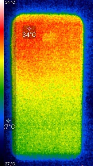 Нагрев больше локализован в верхней правой части аппарата, что, видимо, соответствует расположению микросхемы SoC. По данным теплокамеры, максимальный нагрев составил всего 34 градуса (при температуре окружающего воздуха в 24 градуса), это относительно немного.