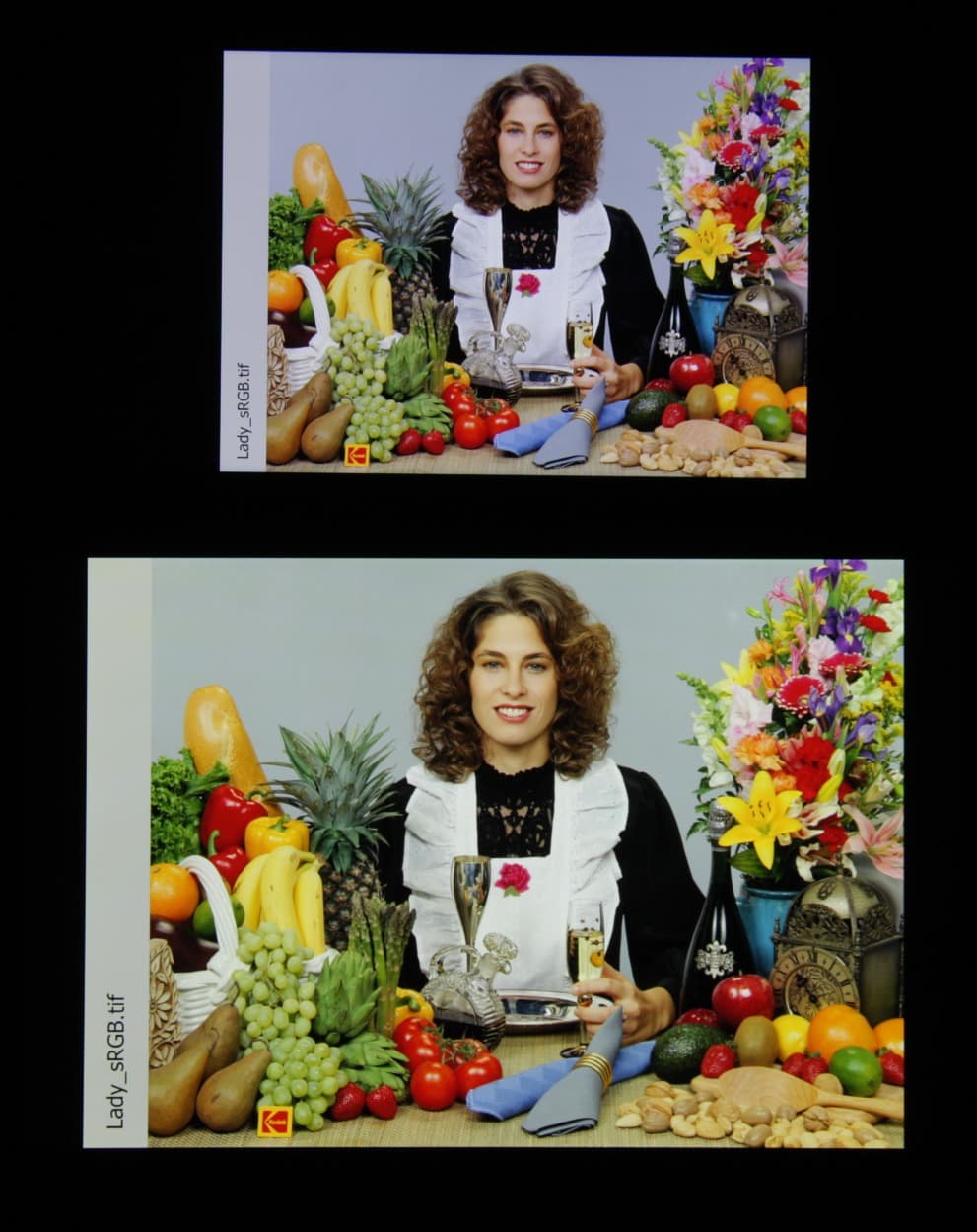 В итоге цвета имеют естественную насыщенность и оттенок. По умолчанию баланс оттенков на шкале серого плохой, так как цветовая температура существенно выше стандартных 6500 К. Отклонение от спектра абсолютно черного тела (ΔE) ниже 10, что для потребительского устройства считается приемлемым показателем, но значительно изменяется от оттенка к оттенку — это отрицательно сказывается на визуальной оценке цветового баланса. (Самые темные области шкалы серого можно не учитывать, так как там баланс цветов не имеет большого значения, да и погрешность измерений цветовых характеристик на низкой яркости большая.)