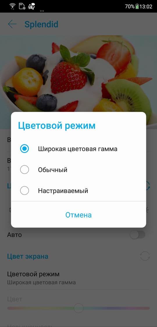 В этом смартфоне есть возможность подправить цветовой баланс регулировкой цветовой температуры (параметр Цветовой режим):