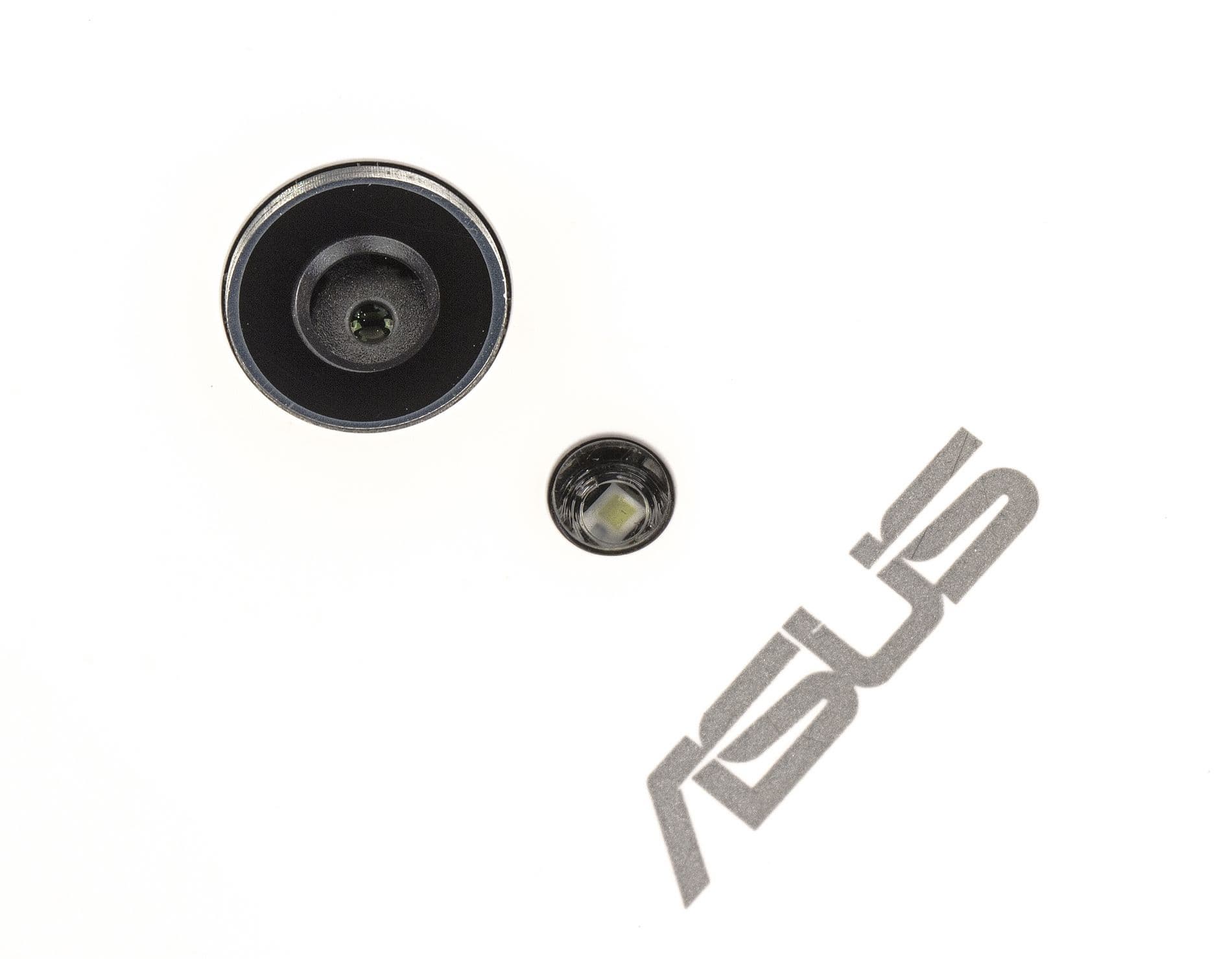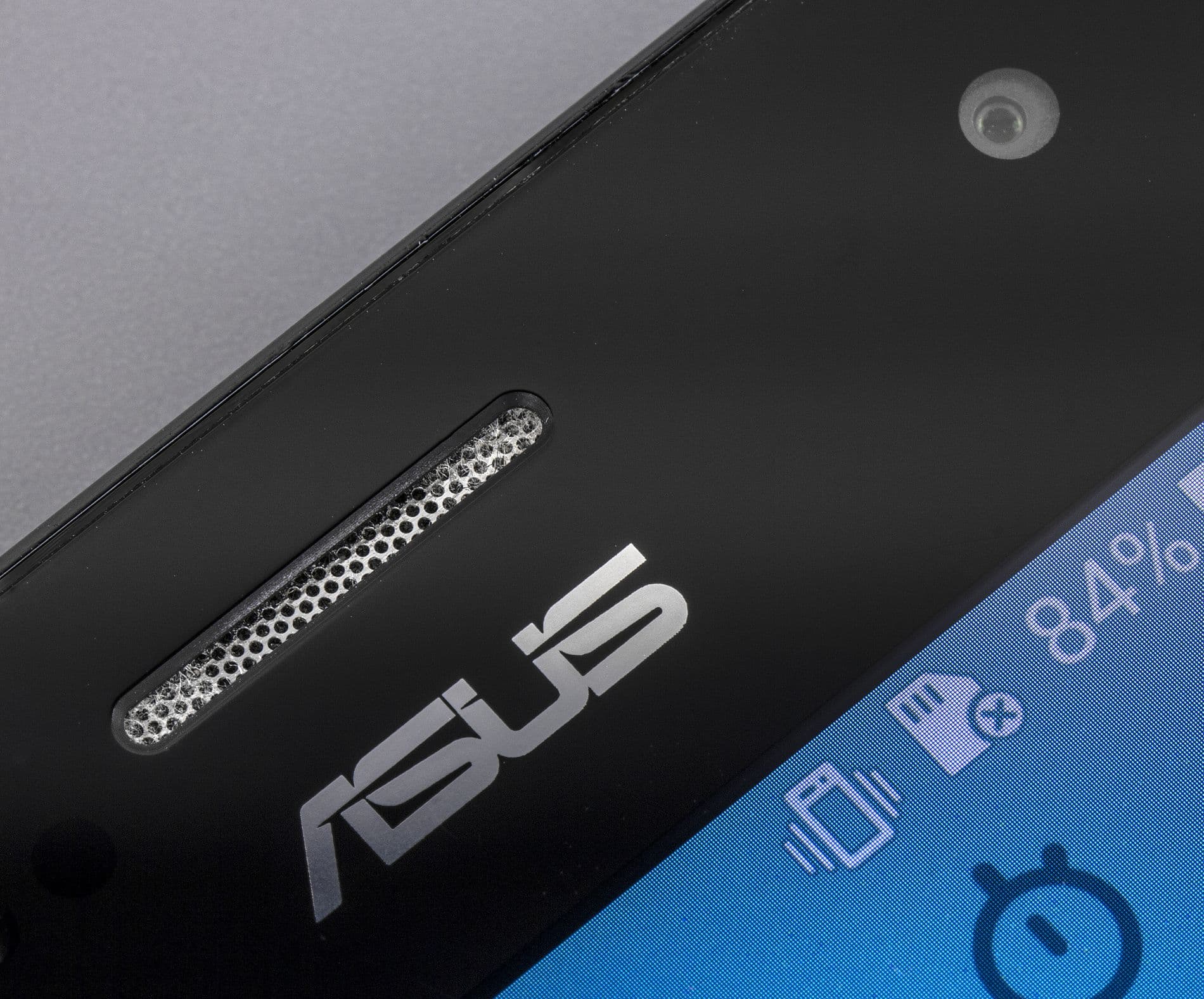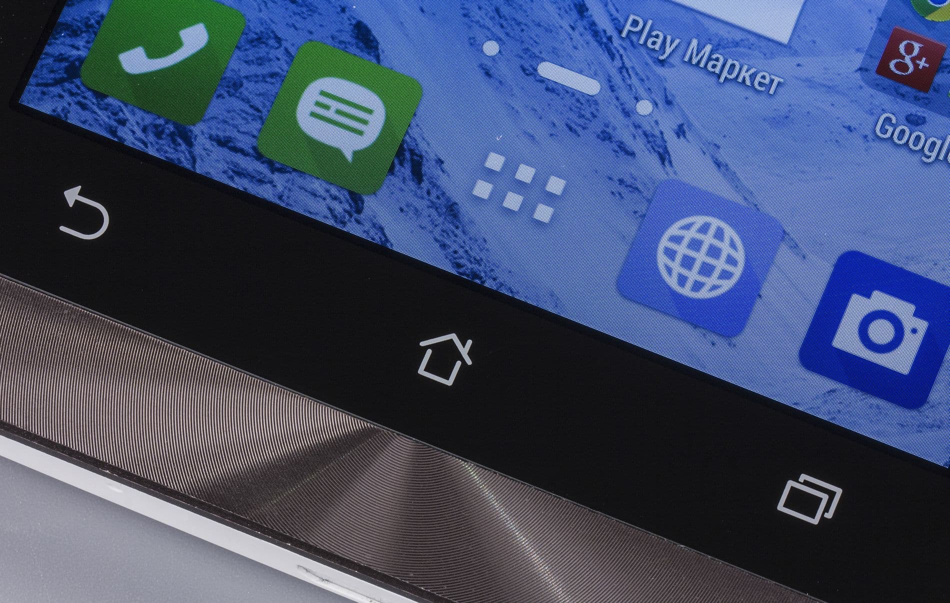 Далеко не вся передняя панель прикрыта защитным стеклом Gorilla Glass 3 — под ним оставлено достаточно много свободного места, и оно ничем не занято. Этот сектор прикрыт металлической тонкой пластинкой с нанесенными на нее традиционными для мобильных продуктов Asus концентрическими кругами «Zen». Зачем здесь оставлено это дополнительное пространство, не совсем понятно: никаких элементов на нем нет — сенсорные кнопки расположились выше, и они тоже занимают прилично места на передней панели. Весьма печально, что эти кнопки не имеют никакой подсветки и в полумраке уже становятся совершенно не видны.