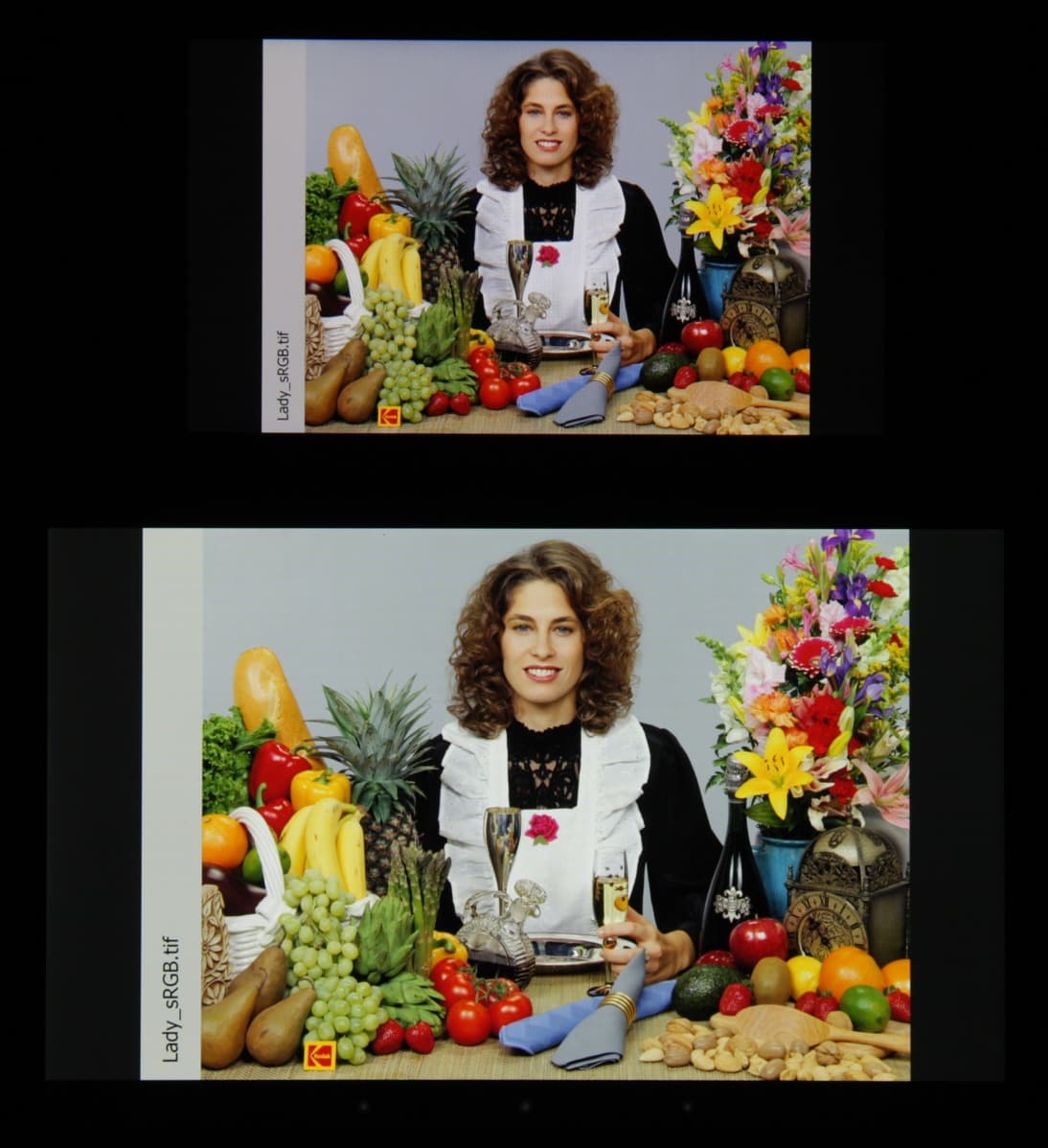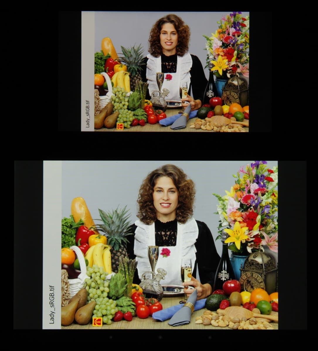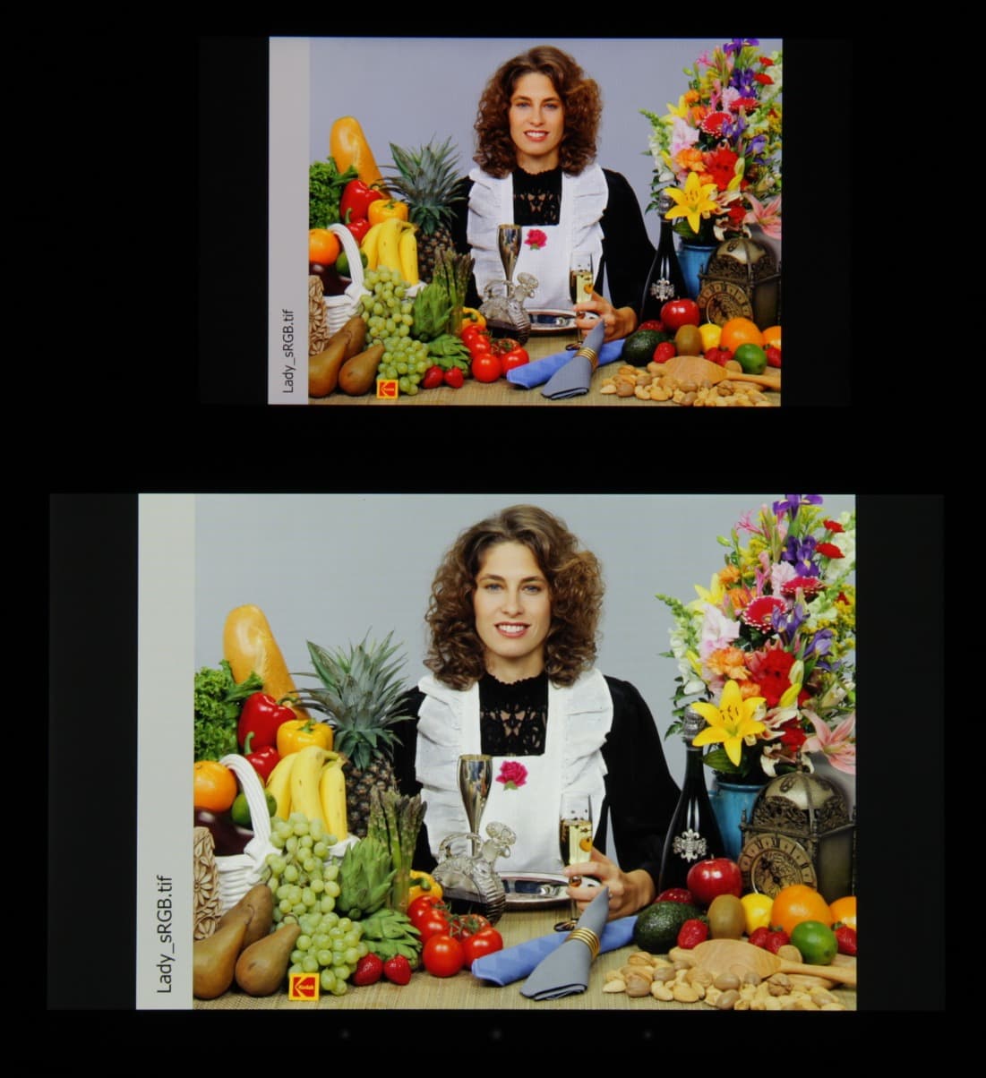 В итоге визуально цвета имеют естественную насыщенность. Баланс оттенков на шкале серого хороший, так как цветовая температура не сильно выше стандартных 6500 К, а отклонение от спектра абсолютно черного тела (ΔE) меньше 10, что для потребительского устройства считается хорошим показателем. При этом цветовая температура и ΔE мало изменяются от оттенка к оттенку — это положительно сказывается на визуальной оценке цветового баланса. (Самые темные области шкалы серого можно не учитывать, так как там баланс цветов не имеет большого значения, да и погрешность измерений цветовых характеристик на низкой яркости большая.)