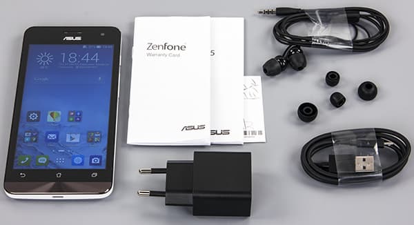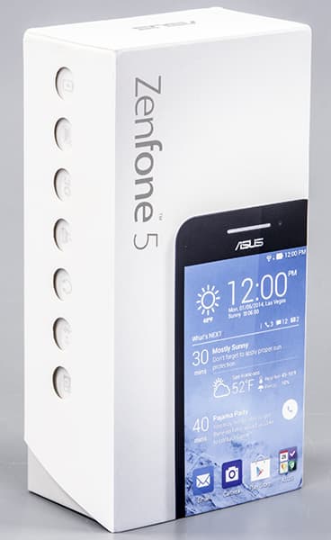 Asus Zenfone 5 поступает в продажу в небольшой упаковке классических габаритов, достаточных для вмещения одного лишь смартфона и небольшого комплекта необходимых аксессуаров. Выполнена коробка из твердого гладкого картона, упаковка аккуратная и качественная. В роли крышки выступает натягивающийся поверх коробки чехол из тонкого картона, в котором прорезано несколько отверстий, совпадающих с картинками на самой коробке. Выглядит все вместе достаточно свежо и стильно.