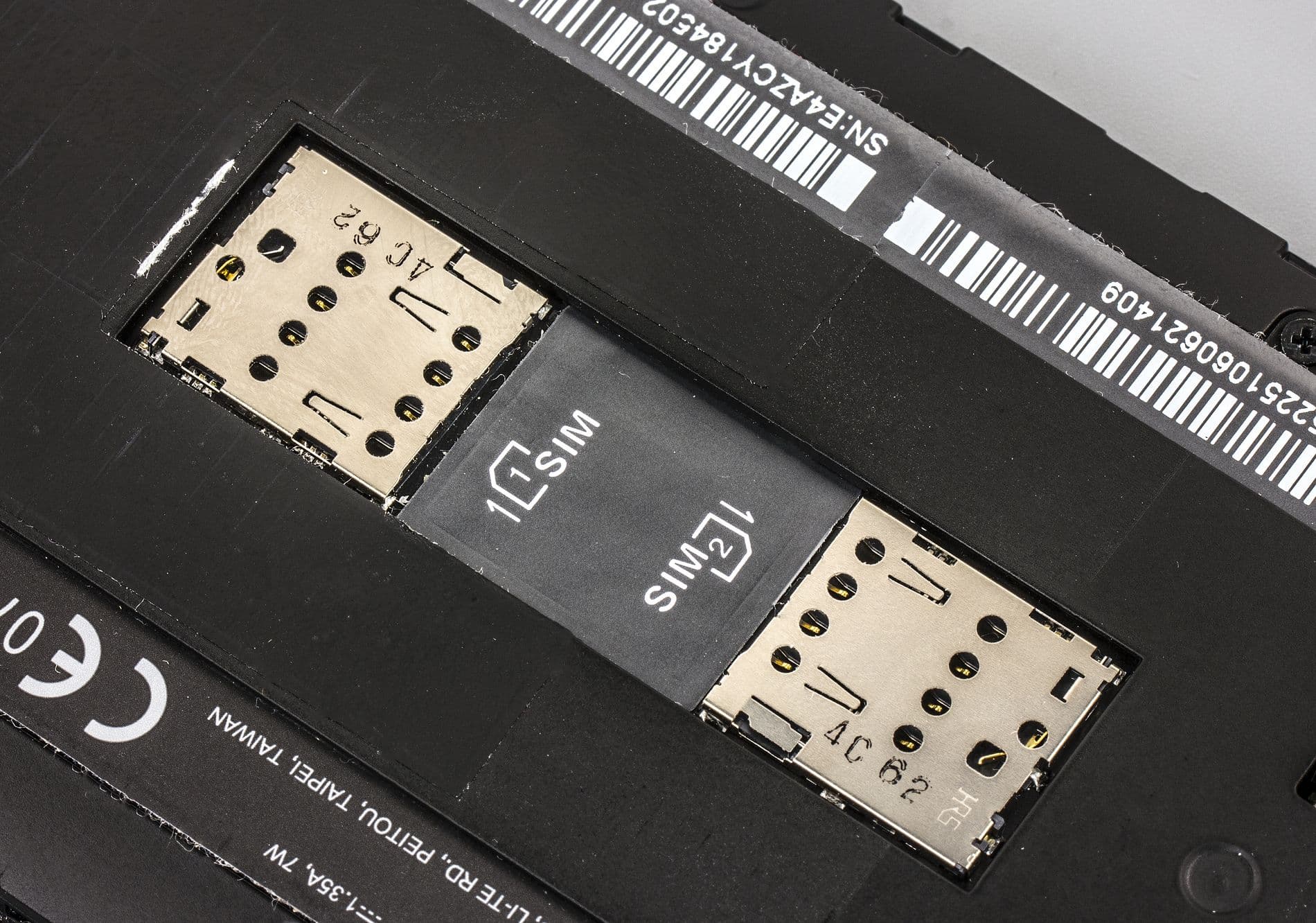 Под крышкой можно найти три слота для карточек: два для SIM-карт и один для карты памяти формата microSD. Обе SIM-карты здесь используются формата «Micro»; все карточки легко вставляются и извлекаются из своих слотов за счет подпружиненных механизмов захвата. Слоты для SIM-карт равнозначны по своим возможностям, необходимо лишь помнить, что одновременно две карты не будут работать в режиме 3G — одну из них придется переключить в 2G.