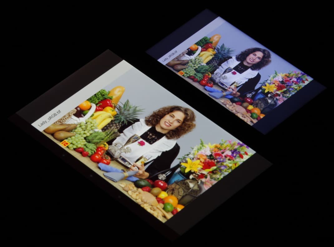 Цветопередача хорошая и цвета насыщенные у обоих экранов, но цветовой баланс несколько различается. Теперь под углом примерно 45 градусов к плоскости и к стороне экрана: