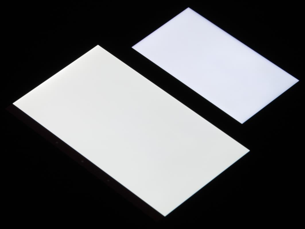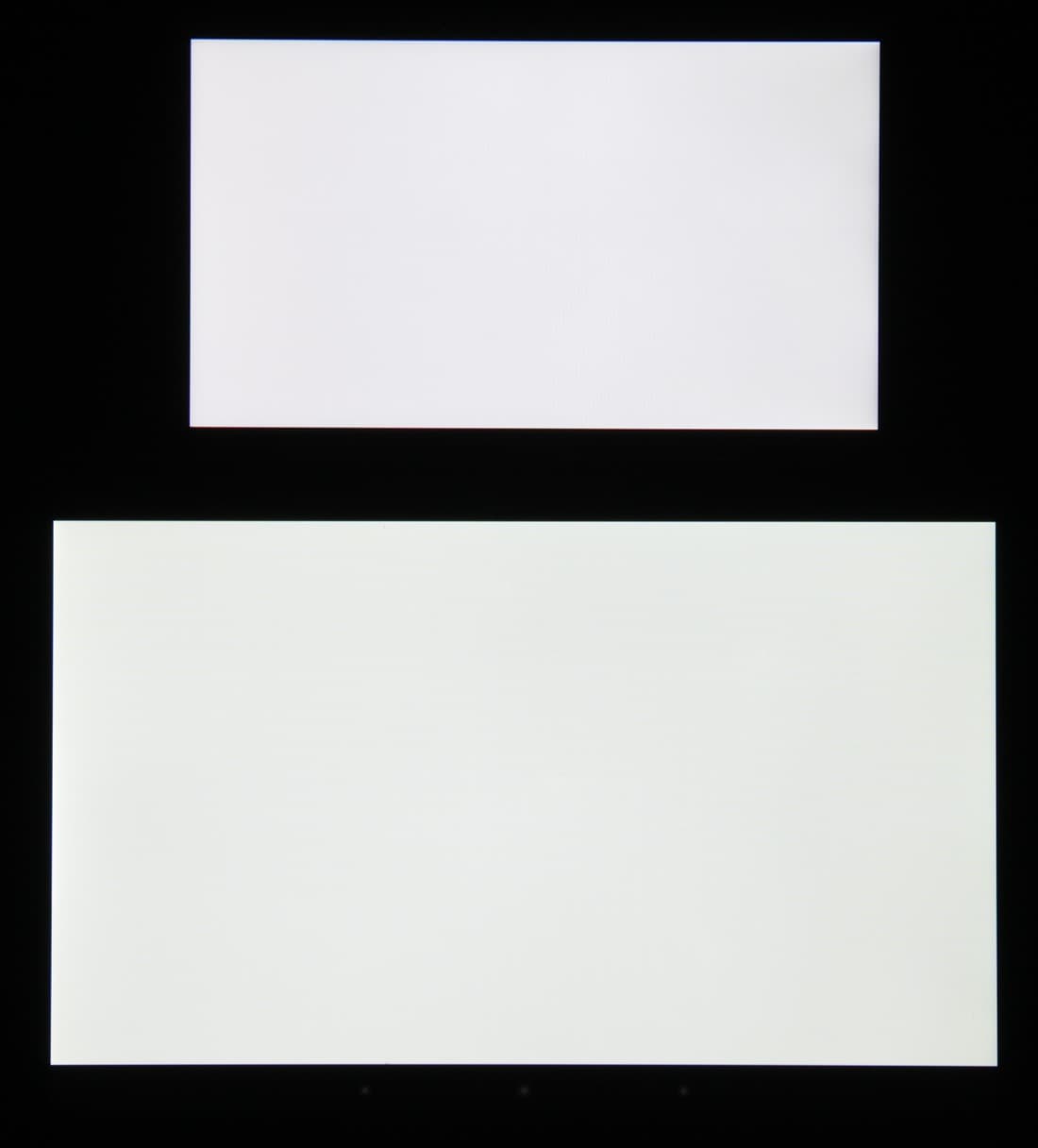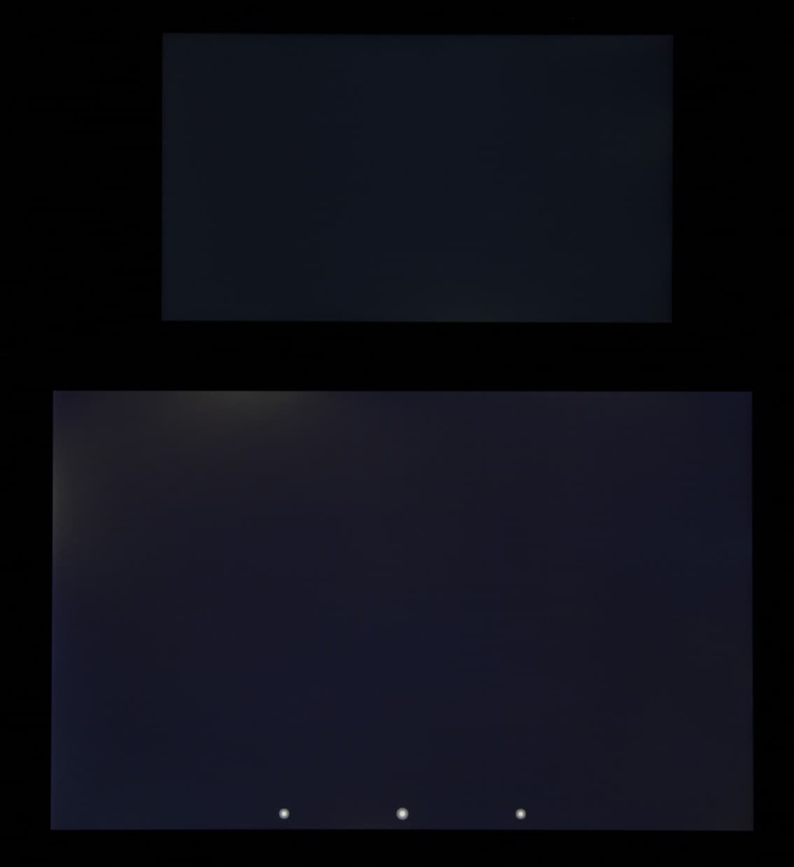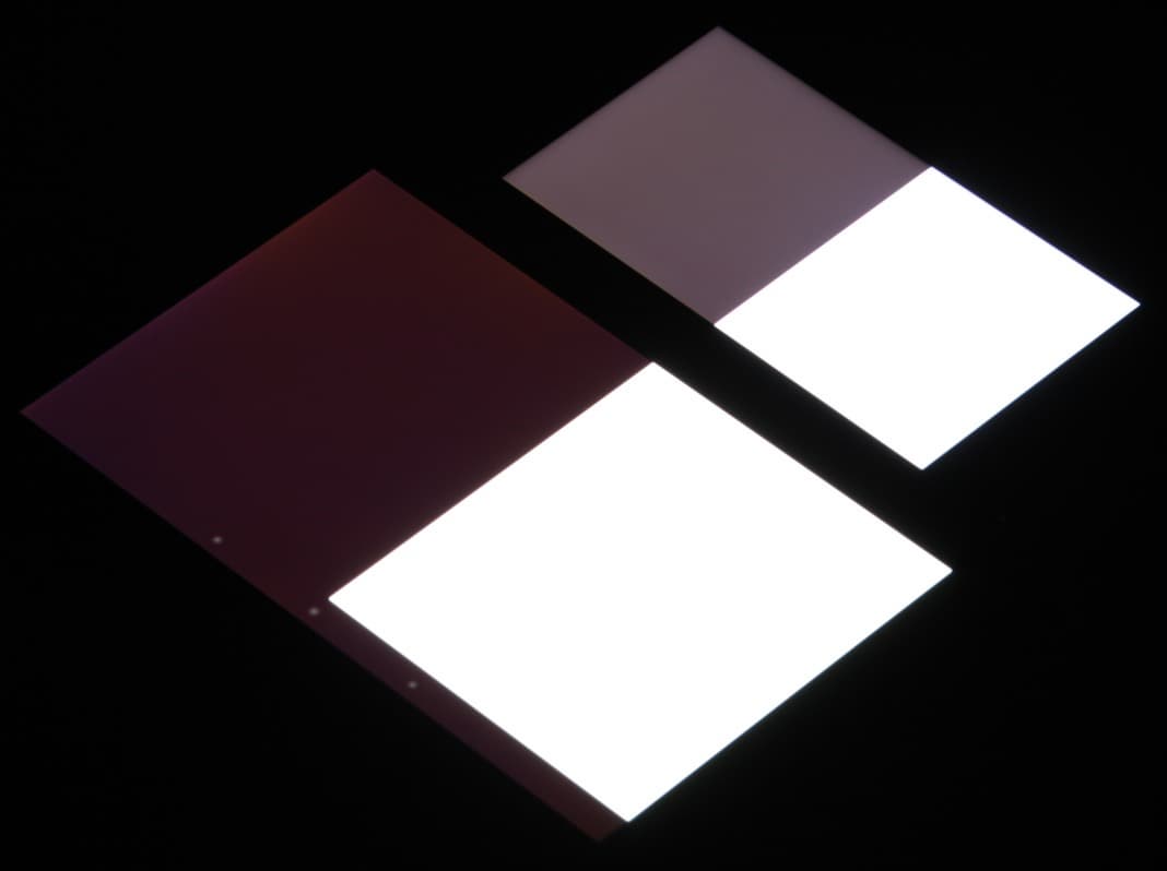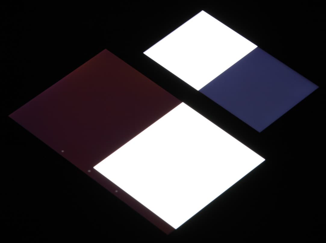 Яркость под углом у экранов уменьшилась (как минимум в 5 раз, исходя из разницы в выдержке), и уменьшилась примерно одинаково. Черное поле при отклонении по диагонали высветляется сильно и приобретает фиолетовый или красно-фиолетовый оттенок. Фотографии ниже это демонстрируют (яркость белых участков в перпендикулярном плоскости экранов направлении примерно одинаковая!):