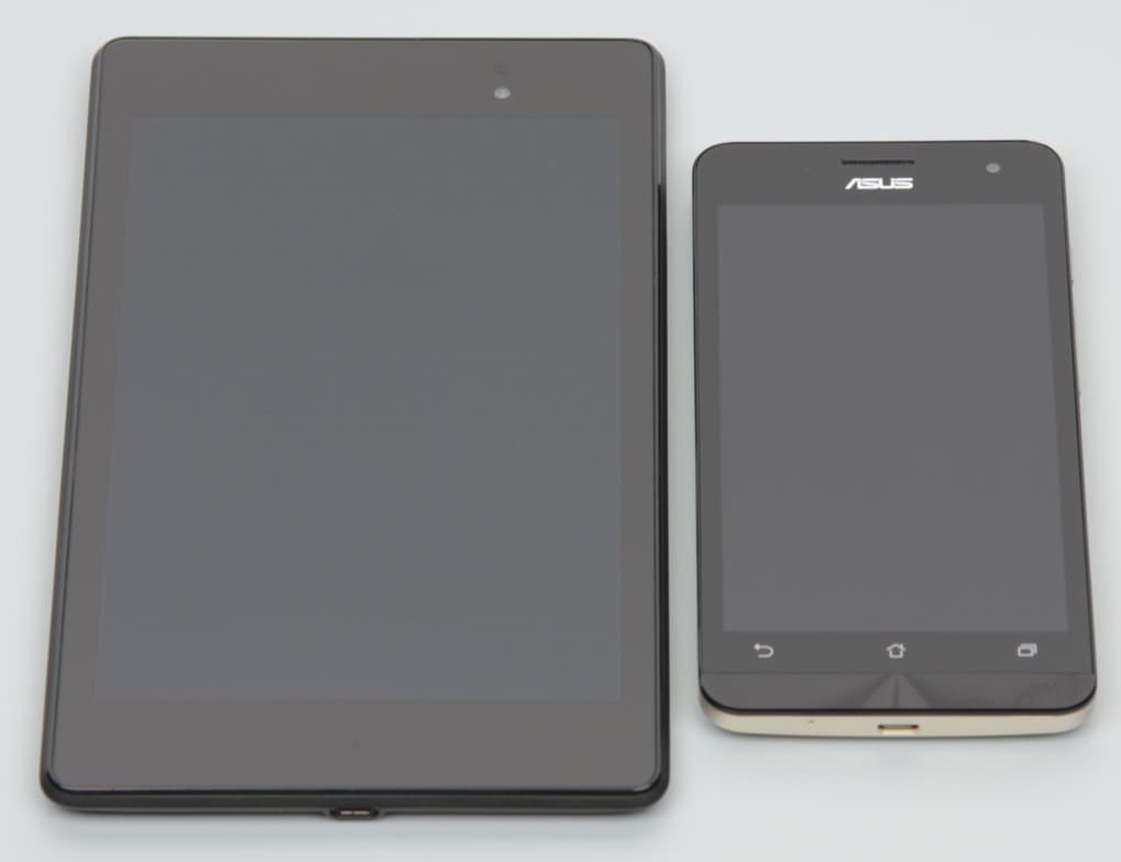 Лицевая поверхность экрана выполнена в виде стеклянной пластины с зеркально-гладкой поверхностью, устойчивой к появлению царапин. Судя по отражению объектов антибликовые свойства экрана не хуже, чем у экрана Google Nexus 7 (2013) (далее просто Nexus 7). Для наглядности приведем фотографию, на которой в выключенных экранах отражается белая поверхность (слева — Nexus 7, справа — Asus Zenfone 5, далее их можно различать по размеру):