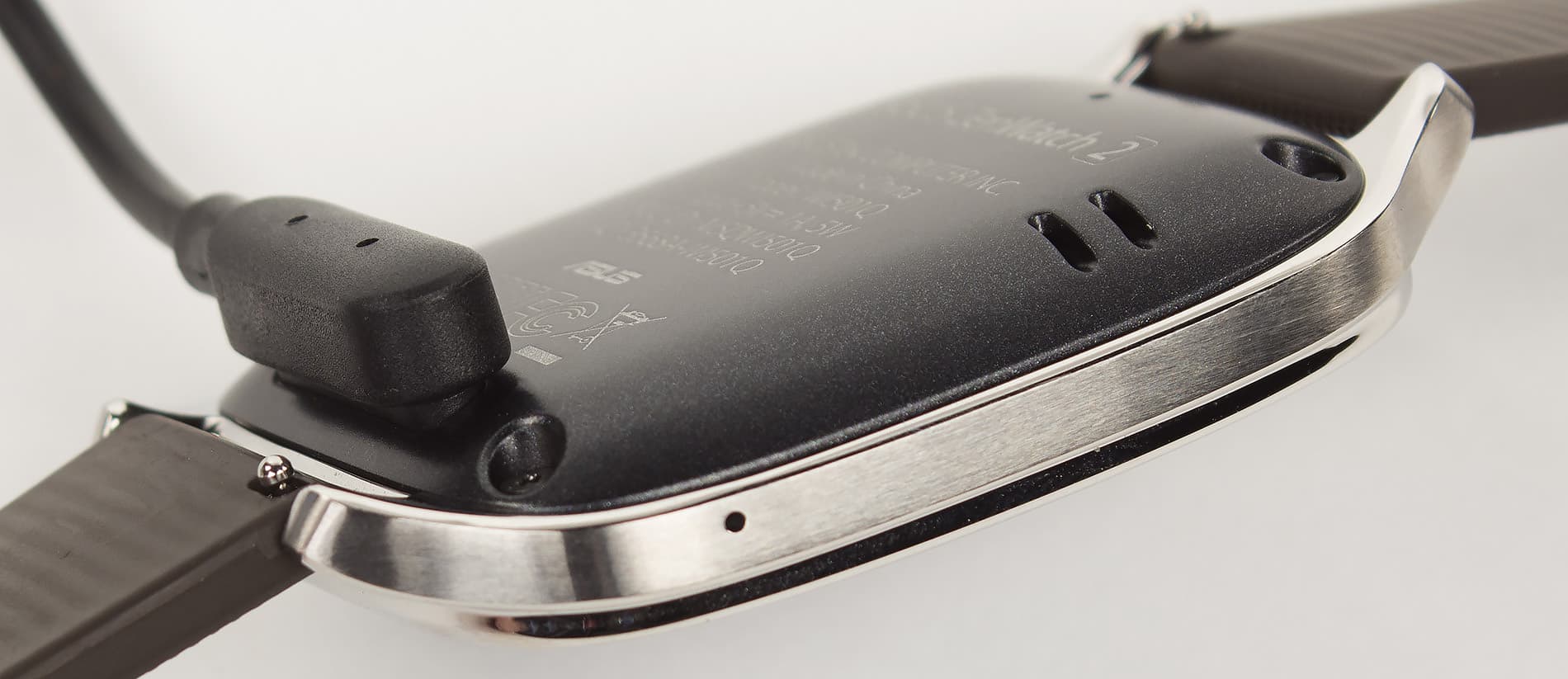 Напомним, что в прошлой версии ZenWatch использовался крэдл, который надо было надевать на корпус часов, и уже к нему подключать кабель. Новое решение, с одной стороны, удобнее и проще (и уж точно компактнее), но с другой стороны — примагничивается коннектор не очень плотно, и для того, чтобы он не отстегнулся от часов, надо найти оптимальное положение.