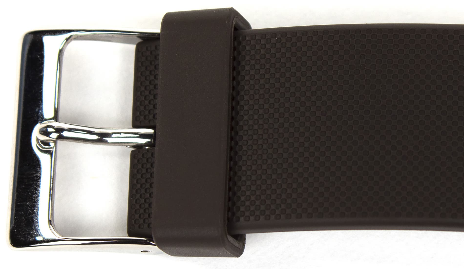 Ремешок состоит из двух половинок, которые крепятся к стальным петлям, выступающим снизу и сверху корпуса. У петель ширина ремешка — стандартная: 22 мм (у версии с экраном 1,45 дюймов она меньше — 20 мм). Как мы уже говорили, в продаже есть множество вариантов ремешков, у нас был самый дешевый — силиконовый. Он имеет рифленую шершавую поверхность, не очень приятную на ощупь. Цвет ремешка, который у нас был — черно-коричневый. Тоже весьма странное решение. К классическому черному или синему костюму такой ремешок подойдет с натяжкой.