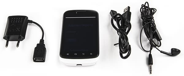 Комплект состоит из простой проводной стереогарнитуры с тонким проводом круглого сечения и пластмассовыми наушниками без амбушюр, соединительного кабеля Micro-USB, а также весьма компактного по размерам зарядного устройства (700 мА). Оно настолько компактно, что USB-разъем пришлось вынести за его пределы на коротком куске кабеля. Выглядит не совсем привычно, но никаких неудобств само по себе не доставляет.