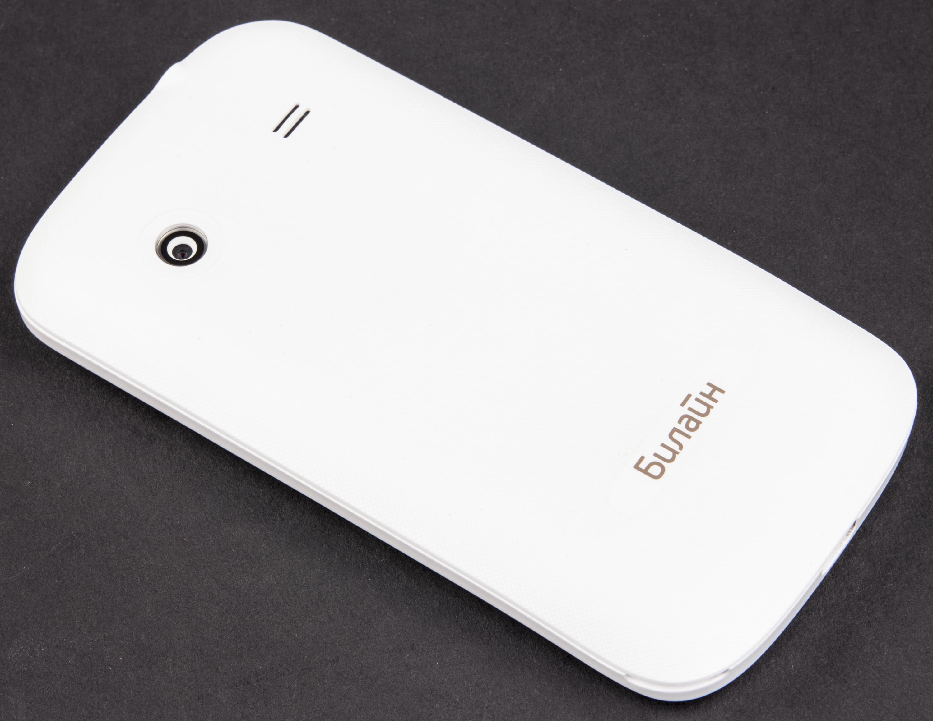 Что касается материалов, то здесь нет металла, корпус целиком пластиковый: скользкий глянцевый ободок, шершавая задняя крышка с пупырчатой текстурой, а также матовый ободок вокруг стекла экрана. Матовых поверхностей у смартфона по площади гораздо больше, чем глянцевых, так что в целом корпус Beeline E600 можно назвать немарким. За счет шершавой задней крышки аппарат надежно удерживается в пальцах.