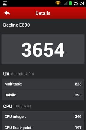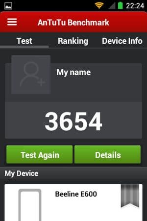 По результатам тестирования смартфон Beeline E600 показал ожидаемо провальные результаты. Его система оказалась вдвое слабее систем начального уровня аппаратов Megafon Login 2 и Optima, поскольку у тех хотя бы по два процессорных ядра Cortex-A7, а здесь всего одно ядро Cortex-A5. В целом можно назвать смартфон Beeline E600 аппаратом самого начального уровня с производительностью столь низкой, что аналог ему на рынке мобильных устройств сейчас трудно отыскать при всем желании. Некоторые из стандартных тестов, таких как Mobile XPRT, Basemark X или 3DMark аппарат частично или полностью не смог осилить.