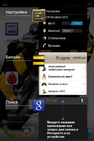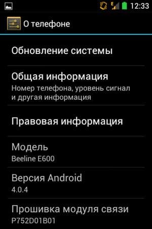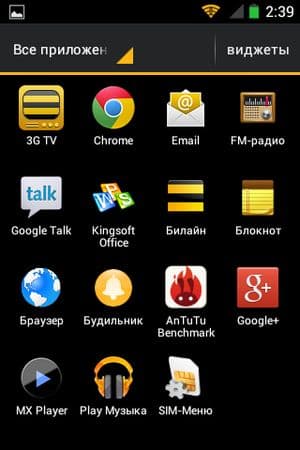 Beeline E600 работает в данный момент на программной платформе Google Android устаревшей версии 4.0. Здесь не установлено никаких альтернативных оболочек, так что все меню, иконки, организация рабочих столов и функциональность панели уведомлений здесь соответствуют «стоковой» Google Android ОС. Естественно, в брендированный аппарат установили массу дополнительных «фирменных» приложений, которые будут интересны лишь пользователям Beeline. Собственно, и сам смартфон будет работать только с SIM-картами этого оператора, если его не разблокировать специальным кодом.