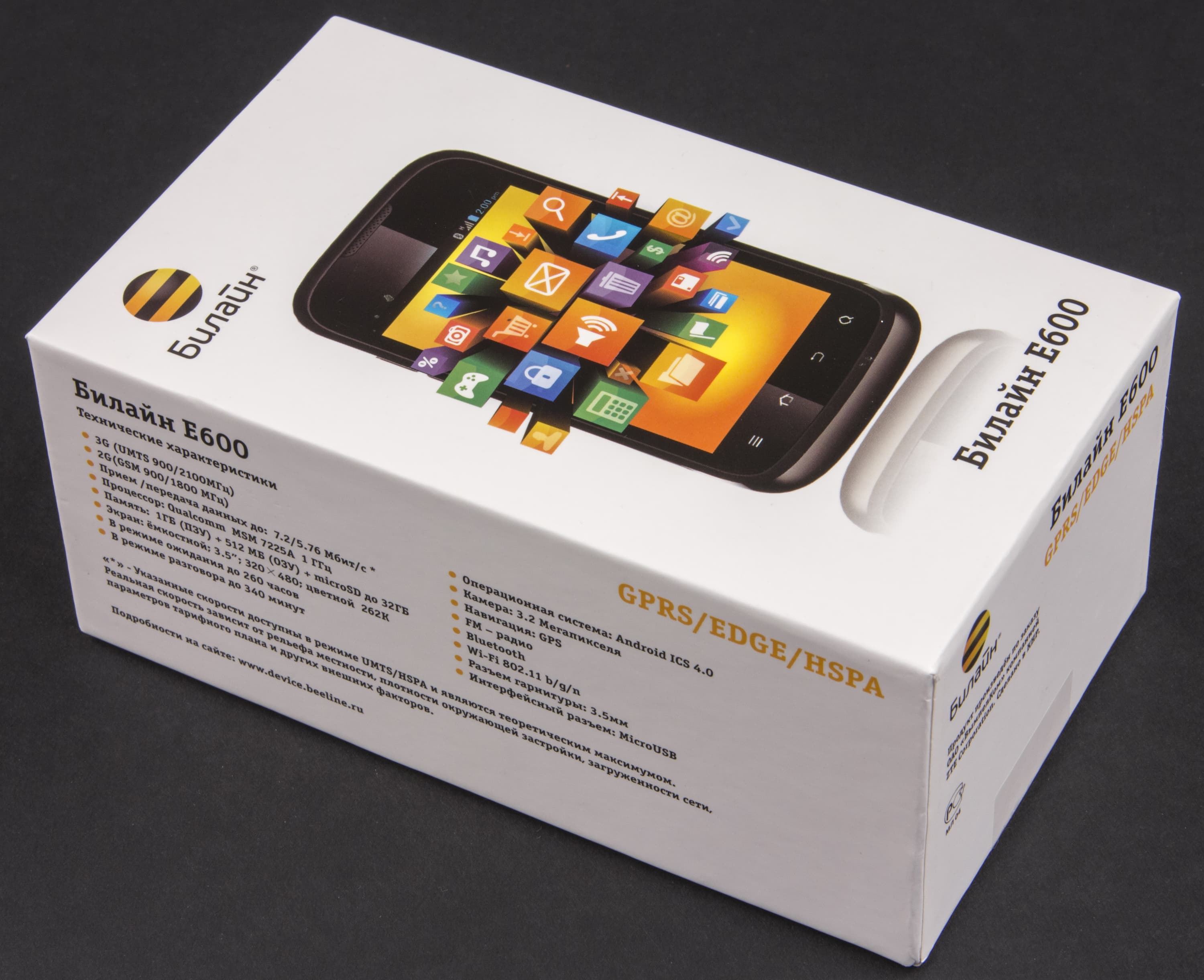 Смартфон Beeline E600 поставляется в продажу в небольшой по размерам качественной упаковке из твердого лакированного картона с одним отделением внутри. Смартфон изначально обклеен пленкой, с нанесенной на нее основной информацией о характеристиках аппарата.