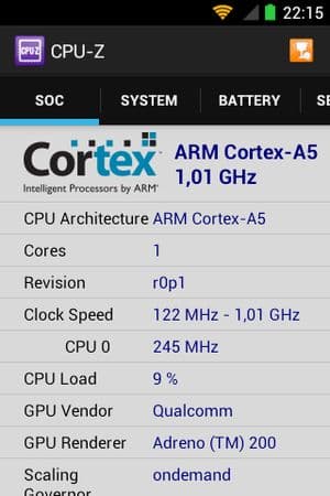 - SoC Qualcomm MSM 7225A, 1 ГГц, 1 ядро ARM Cortex-A5