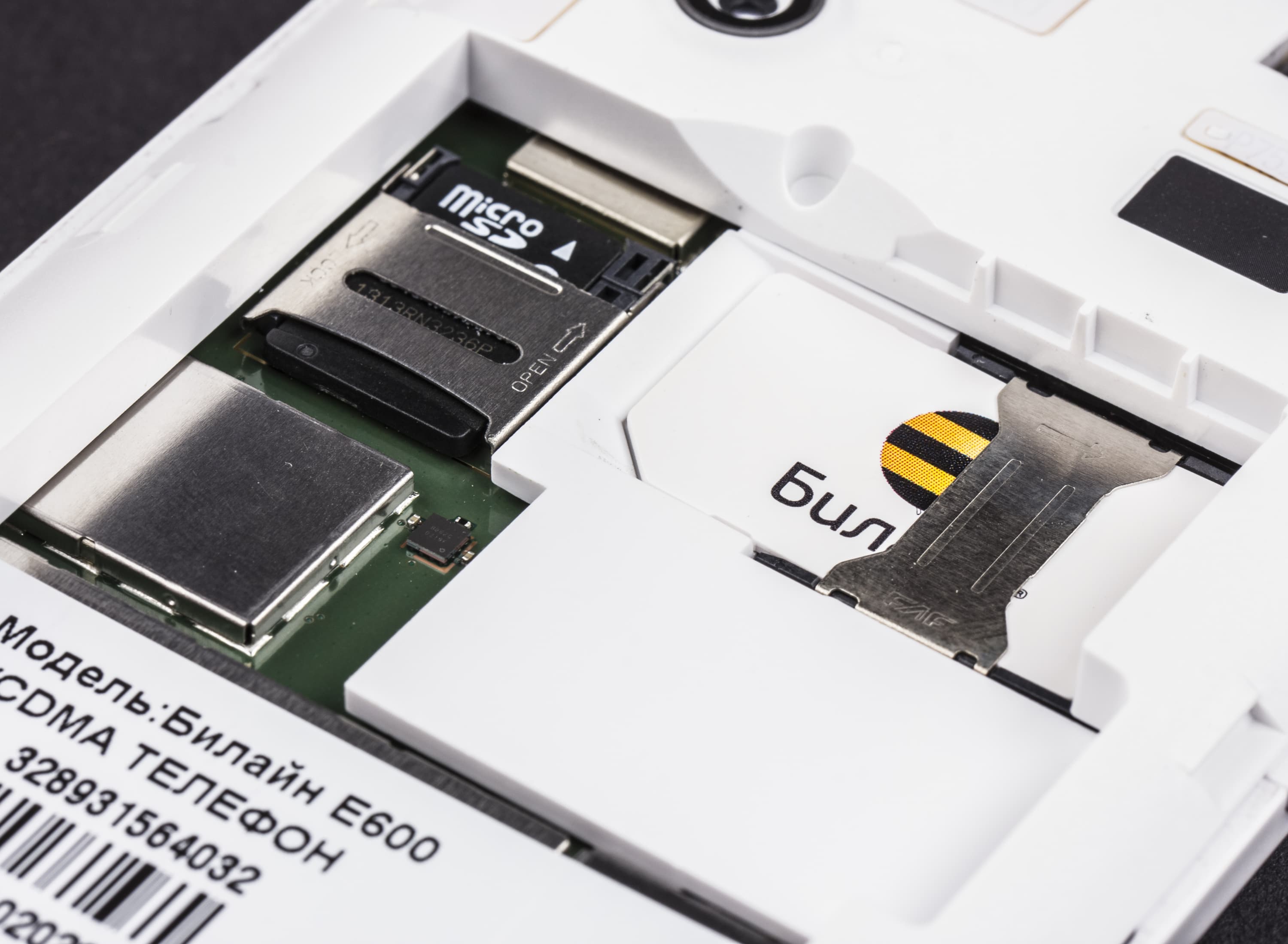 Все карточки, а их здесь может быть установлено две — SIM-карта и карта памяти, — расположены под съемной аккумуляторной батареей, поэтому горячая их замена физически невозможна. SIM-карта используется формата Mini-SIM, карту памяти формата microSD аппарат примет объемом до 32 ГБ.