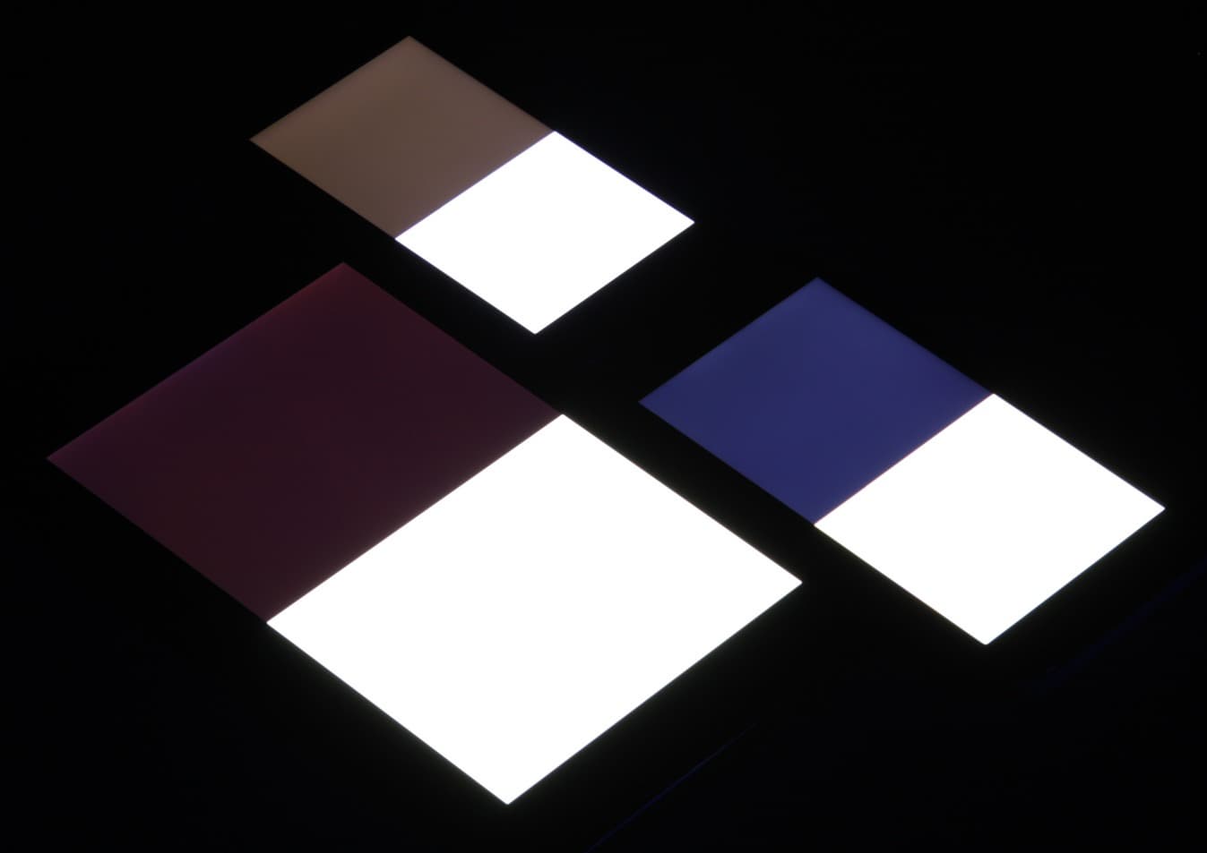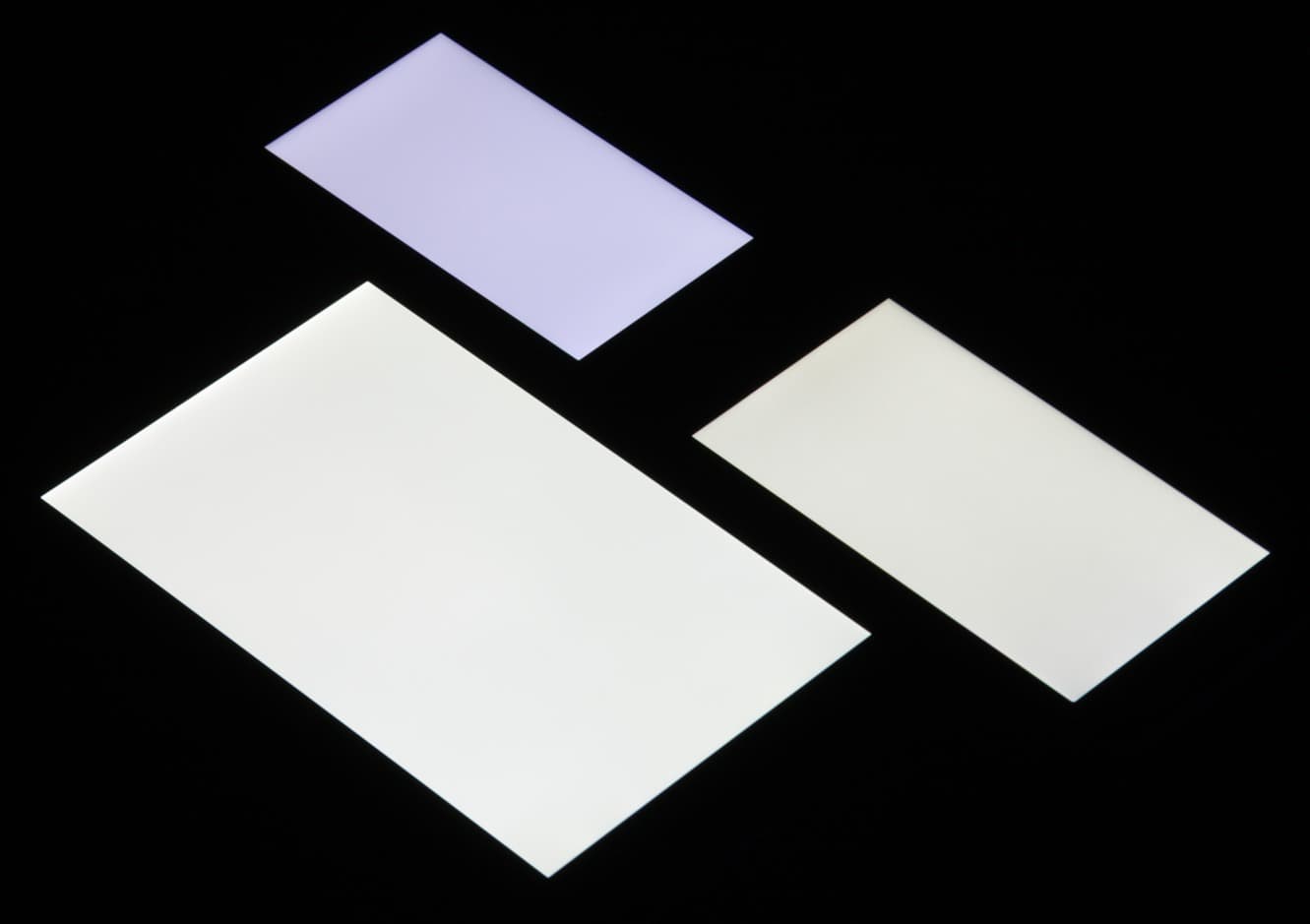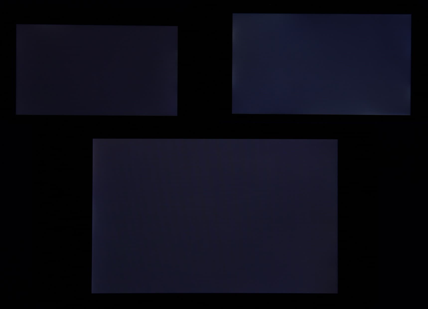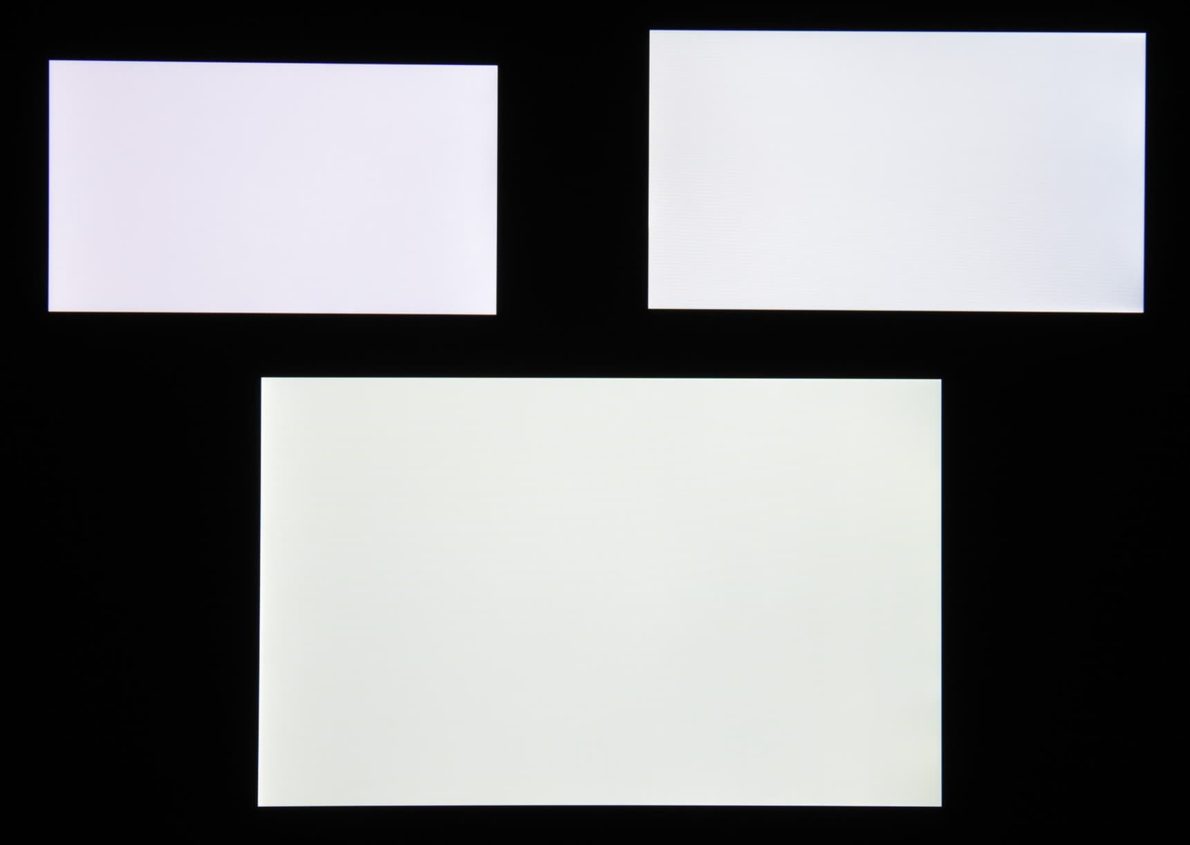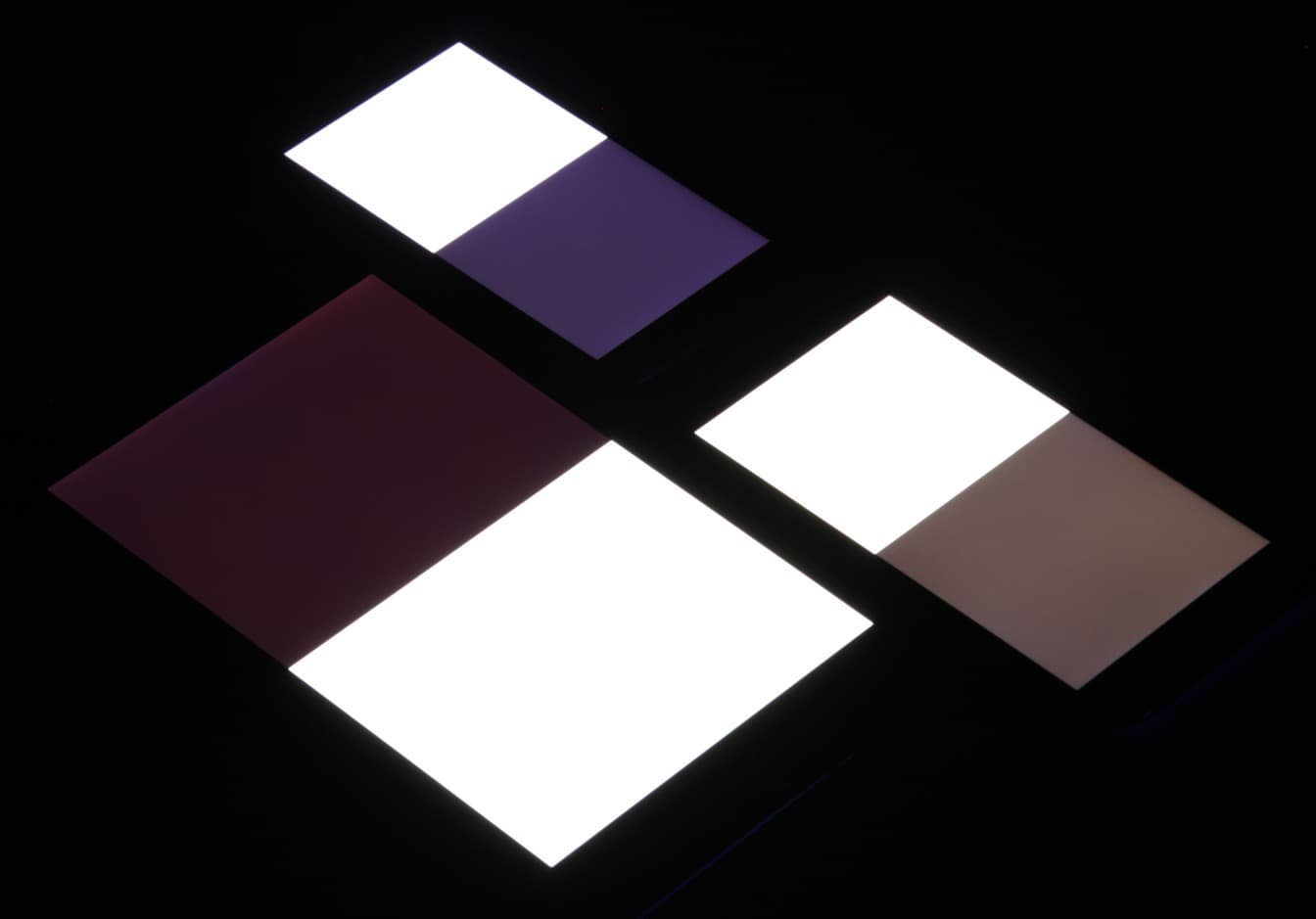 Яркость под углом у экранов уменьшилась (как минимум в пять раз, исходя из разницы в выдержке), однако в случае Билайн «Про 2» и «Про 3» яркость снизилась больше. Черное поле при отклонении по диагонали высветляется сильно и приобретает фиолетовый или красно-фиолетовый оттенок. Фотографии ниже это демонстрируют (яркость белых участков в перпендикулярном плоскости экранов направлении у экранов одинаковая!):