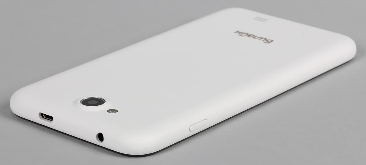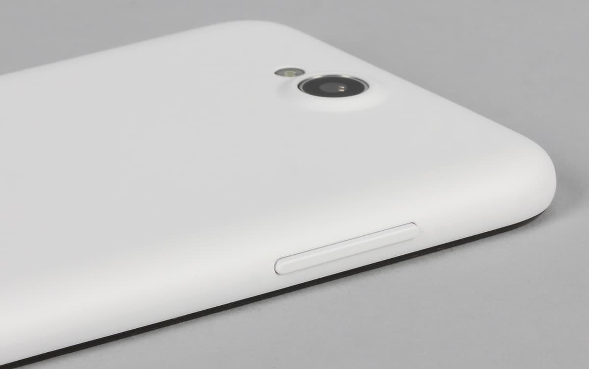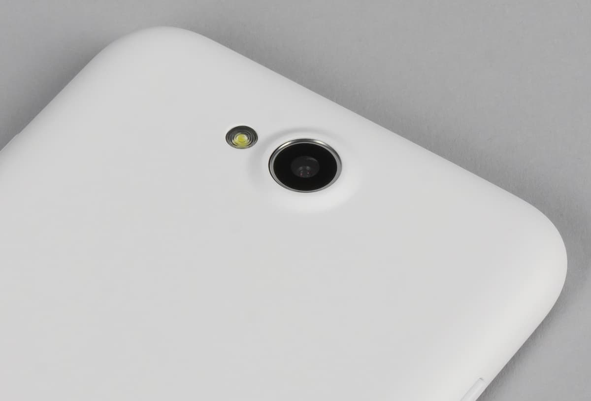 Матовая задняя крышка, как мы уже говорили, придает модели «дорогой» вид (и помогает сократить число заметных отпечатков пальцев). В частности он обеспечивается и использованием не чистого белого цвета, а скорее варианта «слоновая кость». В верхней ее части слева выступает на пару миллиметров объектив камеры. Он окаймлен вставкой из пластика «под металл», которая также имеет невысокий бортик. Отказ от круглой формы здесь также очень удачен. Справа от камеры мы видим светодиодную вспышку.