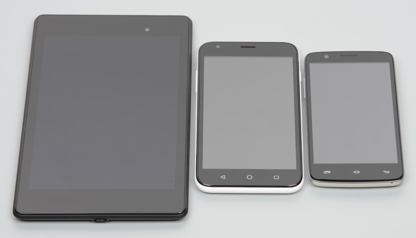 Лицевая поверхность экранов выполнена в виде стеклянной пластины с зеркально-гладкой поверхностью, устойчивой к появлению царапин (на Про3 была наклеена защитная пленка, но мы ее сняли). Судя по отражению объектов антибликовые свойства экранов гораздо хуже, чем у экрана Google Nexus 7 (2013) (далее просто Nexus 7). У обоих смартфонов поверхность самой матрицы под стеклом слегка матовая, поэтому экран отражает как прямые источники света (внешней поверхностью), так и рассеянный свет (поверхностью матрицы), это уменьшает читаемость в условиях сильной внешней засветки. Для наглядности приведем фотографию, на которой в выключенных экранах отражается белая поверхность. Слева — Nexus 7, правее — сначала Билайн «Про 3» (побольше), затем «Про 2» (поменьше), далее их можно различать по размеру: