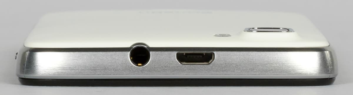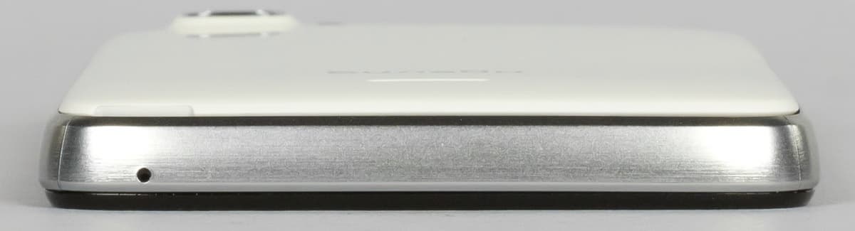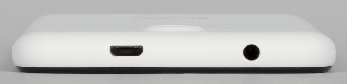 Боковые ребра смартфона выглядят очень похожими на металл, но в реальности это пластик. Они имеют небольшой скос, что позволяет более удобно поднимать устройство со стола, если оно лежало экраном вверх. На верхнем торце находятся выход для гарнитуры и порт Micro-USB, а снизу можно заметить отверстие микрофона.