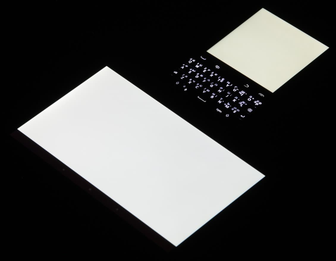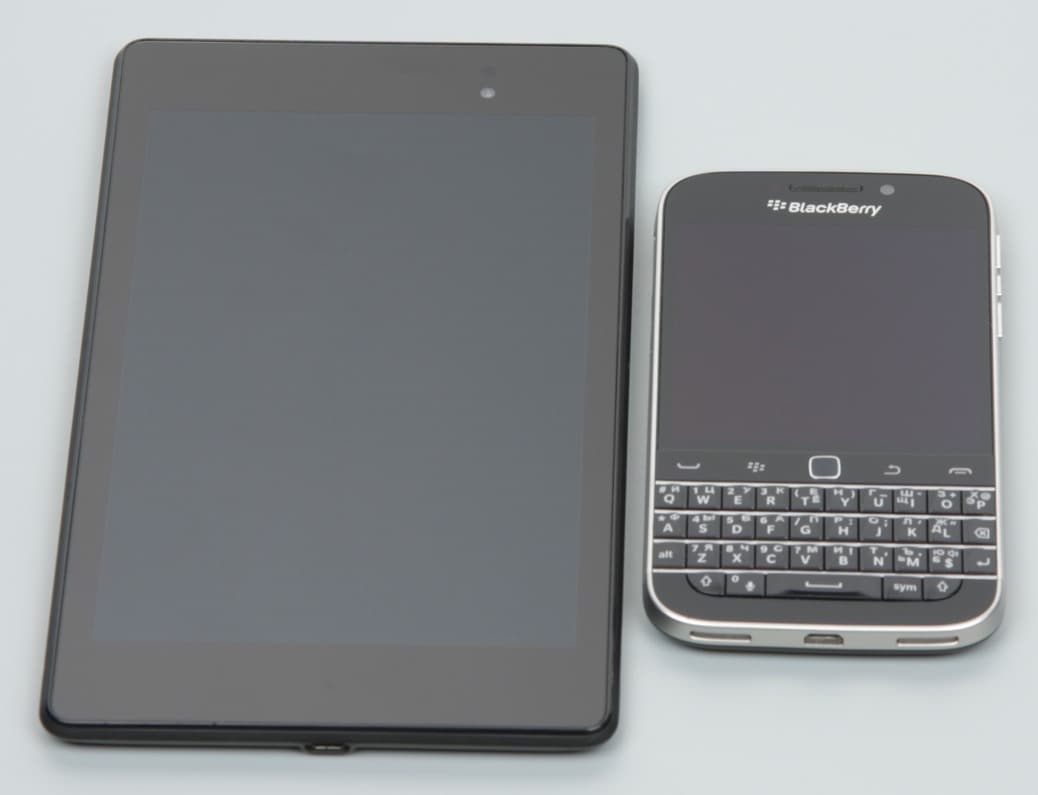 Лицевая поверхность экрана выполнена в виде стеклянной пластины с зеркально-гладкой поверхностью, устойчивой к появлению царапин. Судя по отражению объектов антибликовые свойства экрана не хуже, чем у экрана Google Nexus 7 (2013) (далее просто Nexus 7). Для наглядности приведем фотографию, на которой в выключенных экранах отражается белая поверхность (слева — Nexus 7, справа — BlackBerry Classic, далее их можно различать по размеру):