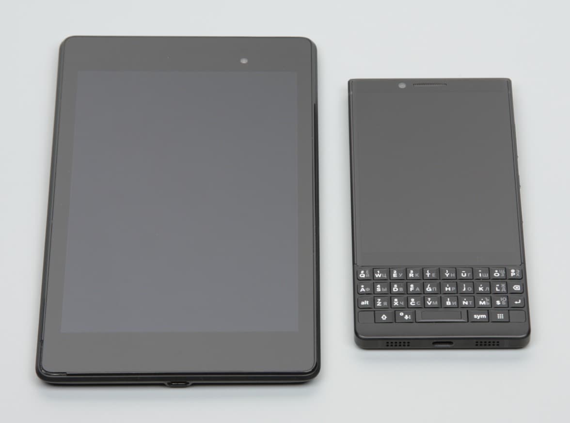 Лицевая поверхность экрана выполнена в виде стеклянной пластины с зеркально-гладкой поверхностью, устойчивой к появлению царапин. Судя по отражению объектов, антибликовые свойства экрана лучше, чем у экрана Google Nexus 7 (2013) (далее просто Nexus 7). Для наглядности приведем фотографию, на которой в выключенных экранах отражается белая поверхность (слева — Nexus 7, справа — BlackBerry Key2, далее их можно различать по размеру):